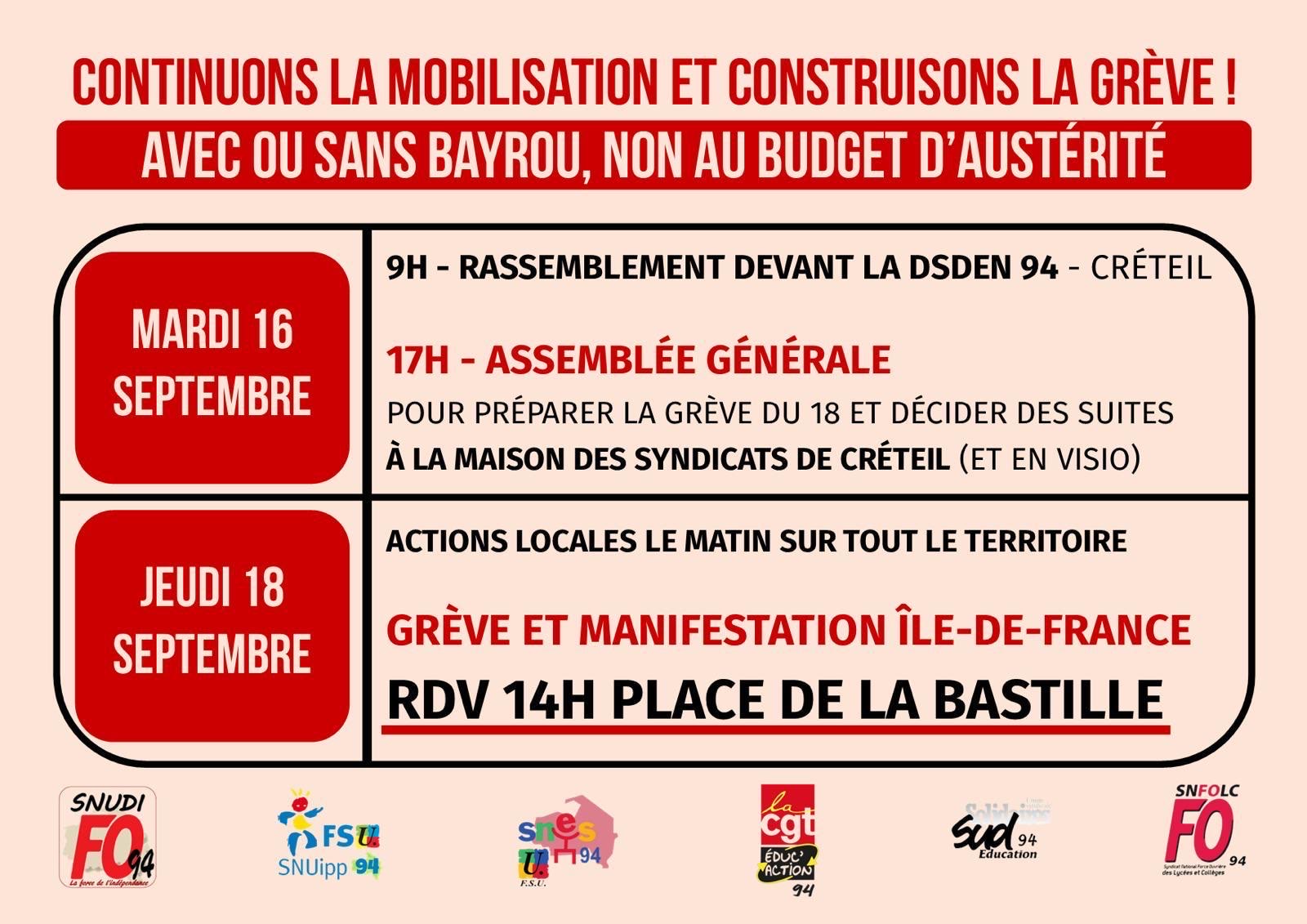 Vous êtes ici : Accueil actu des établissements Val-de-Marne Mobilisation dans le 94 pour une autre politique 3 octobre 2025 actu des établissements Mobilisation dans le 94 pour une autre politique Le SNES-FSU 94 appelle à la grève et à la mobilisation le 2 octobre 2025. Ci-dessous le préavis de grève déposé par le SNES FSU 94.
