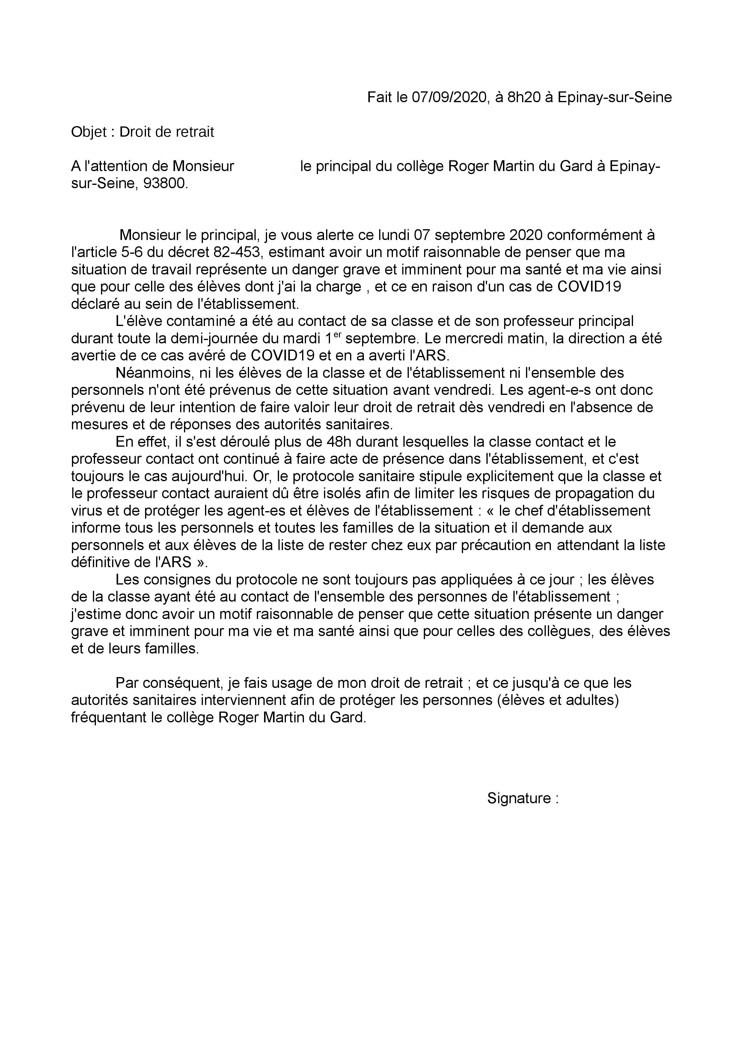 Vous êtes ici : Accueil actu des établissements Seine-Saint-Denis 39 collègues exercent leur droit de retrait au CLG Roger Martin du Gard (Épinay-sur-Seine) - 07.09.2020 8 septembre 2020 actu des établissements 39 collègues exercent leur droit de retrait au CLG Roger Martin du Gard (Épinay-sur-Seine) - 07.09.2020