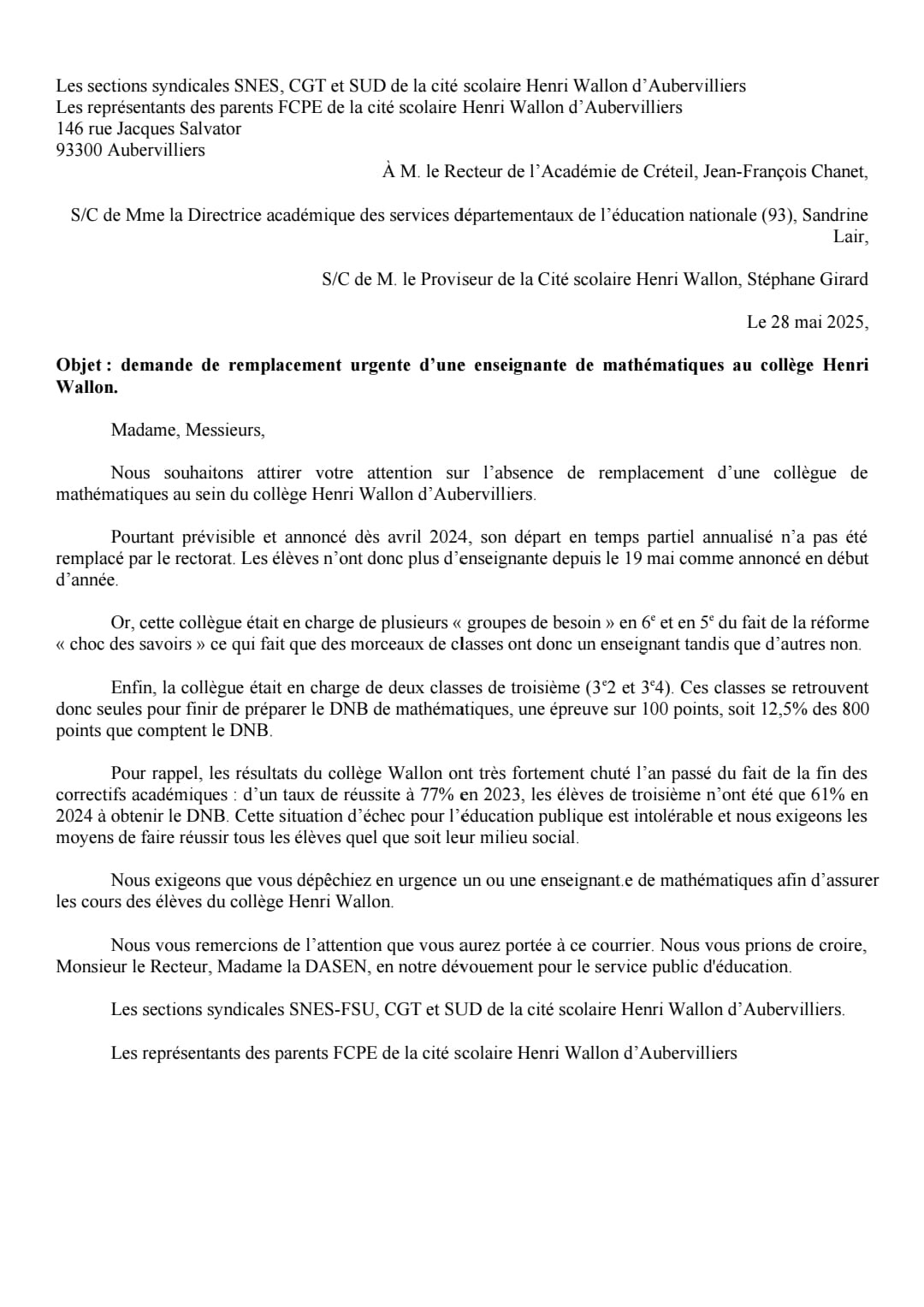 Vous êtes ici : Accueil actu des établissements Seine-Saint-Denis Au collège Henri Wallon (Aubervilliers) il manque un.e enseignant.e en Mathématiques 2 juin 2025 actu des établissements Au collège Henri Wallon (Aubervilliers) il manque un.e enseignant.e en Mathématiques Courrier au rectorat et à la DSDEN 93 des sections syndicales et des parents d’élèves du collège.