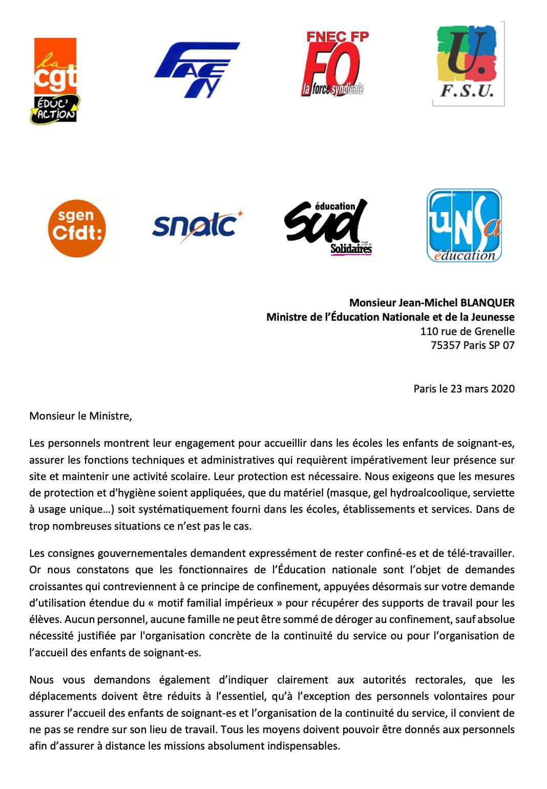 Ci dessous, le dernier courrier intersyndical, sur les injonctions de déplacements pour les professeurs et les parents :