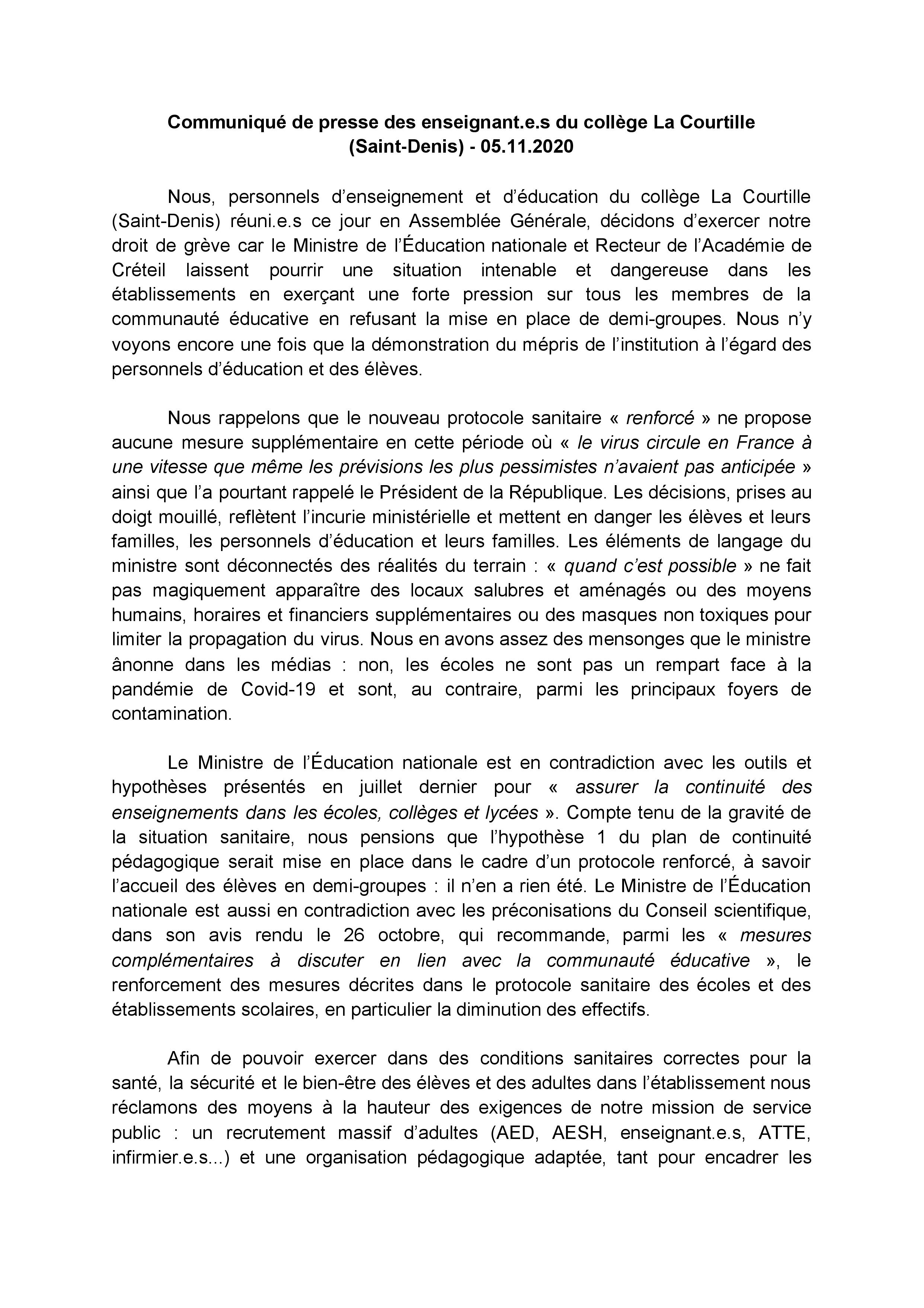 Vous êtes ici : Accueil actu des établissements Seine-Saint-Denis Communiqué de grève - CLG La Courtille (Saint-Denis) - 05.11.2020 6 novembre 2020 actu des établissements Communiqué de grève - CLG La Courtille (Saint-Denis) - 05.11.2020