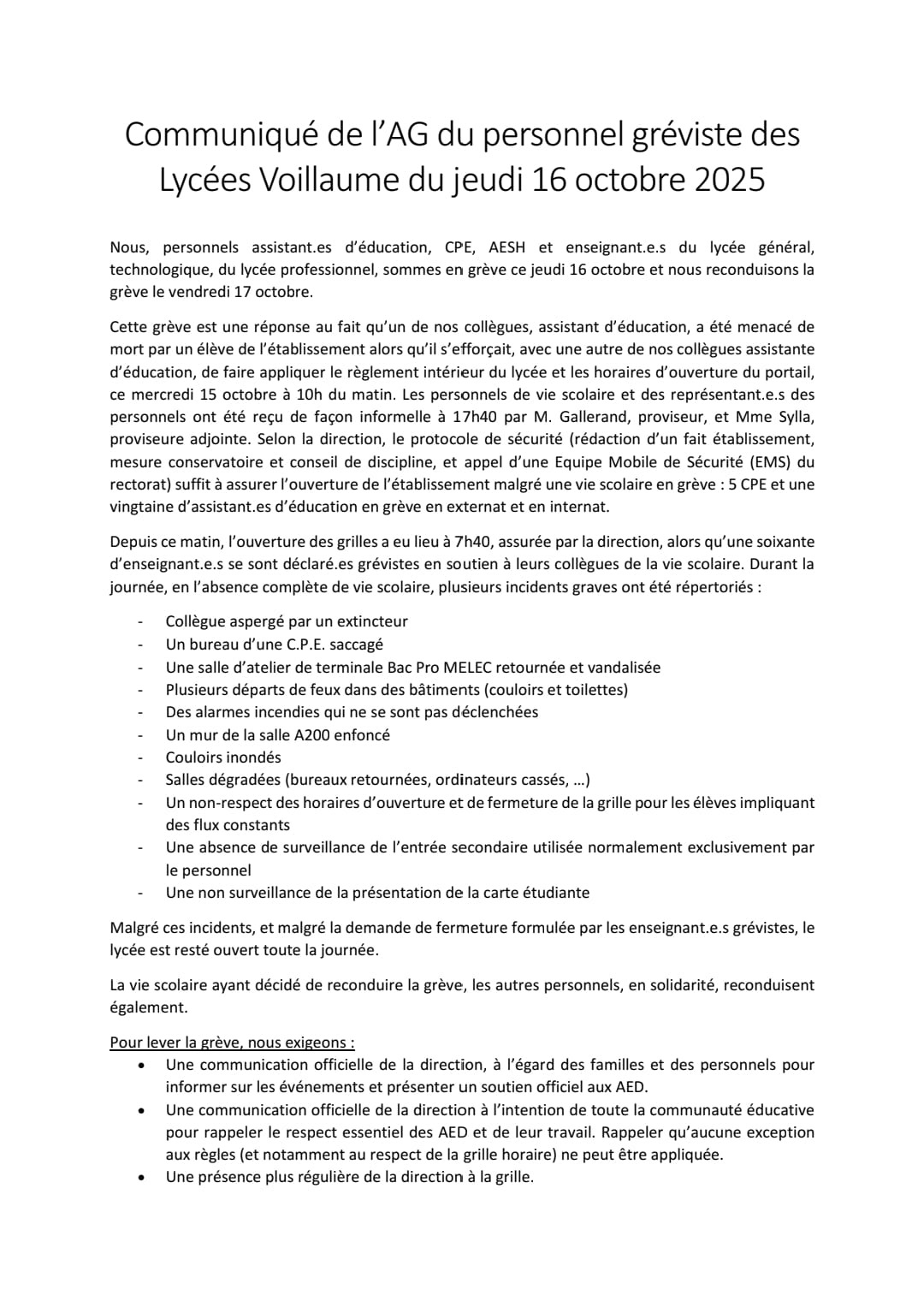 Vous êtes ici : Accueil actu des établissements Seine-Saint-Denis Communiqué de l’AG du personnel gréviste du Lycée Voillaume (Aulnay sous Bois) 16 octobre 2025 actu des établissements Communiqué de l’AG du personnel gréviste du Lycée Voillaume (Aulnay sous Bois)