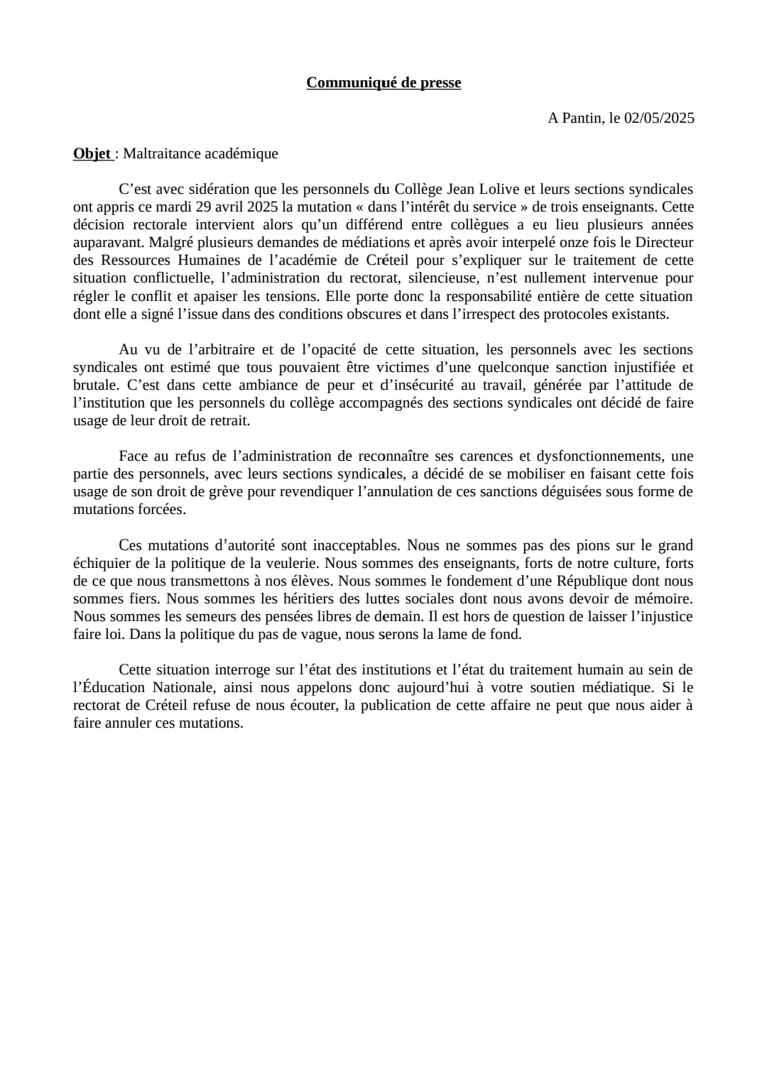 Vous êtes ici : Accueil actu des établissements Seine-Saint-Denis Communiqué de presse des personnels du collège Jean Lolive (Pantin) 2 mai 2025 actu des établissements Communiqué de presse des personnels du collège Jean Lolive (Pantin)