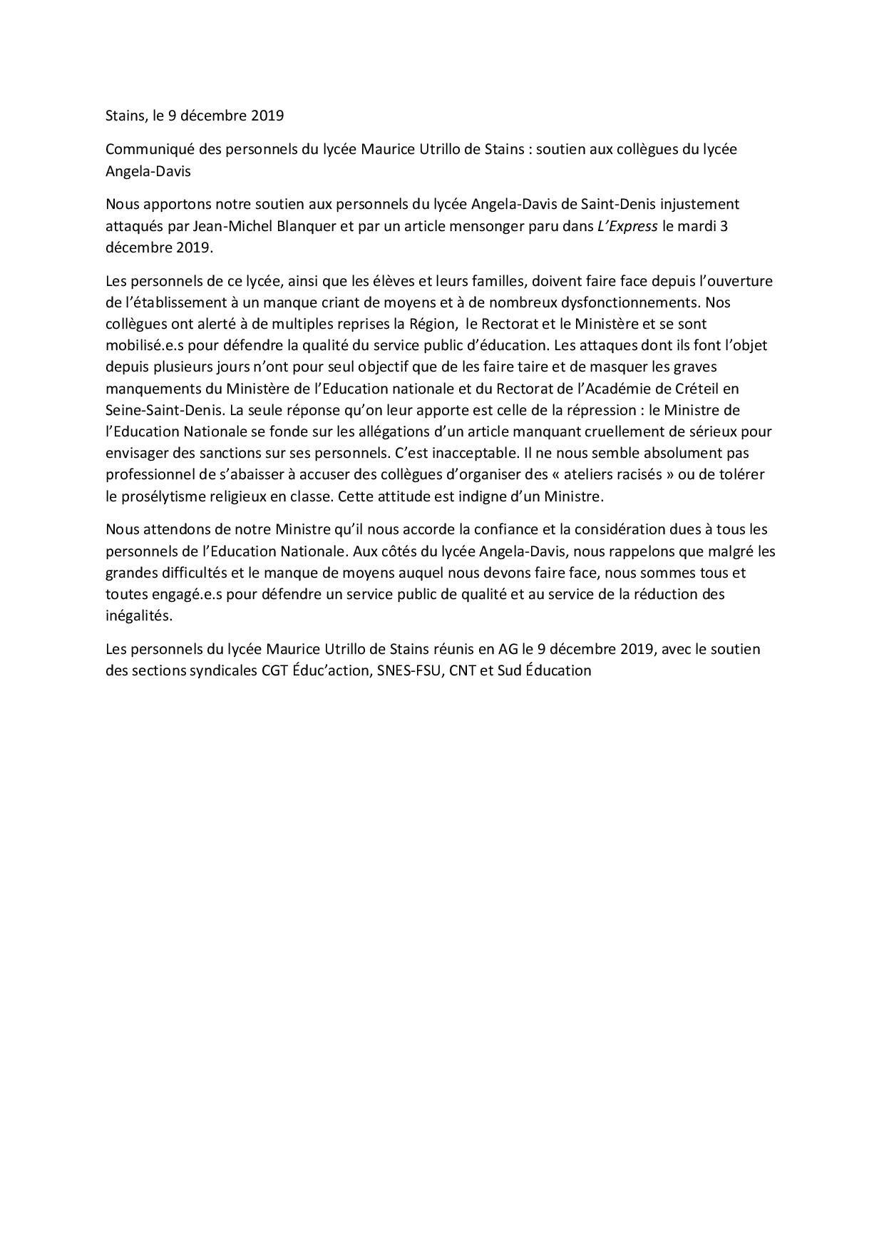 Vous êtes ici : Accueil actu des établissements Seine-Saint-Denis Communiqué de soutien aux collègues d’Angela-Davis - Lycée Utrillo (Stains) 11 décembre 2019 actu des établissements Communiqué de soutien aux collègues d’Angela-Davis - Lycée Utrillo (Stains)