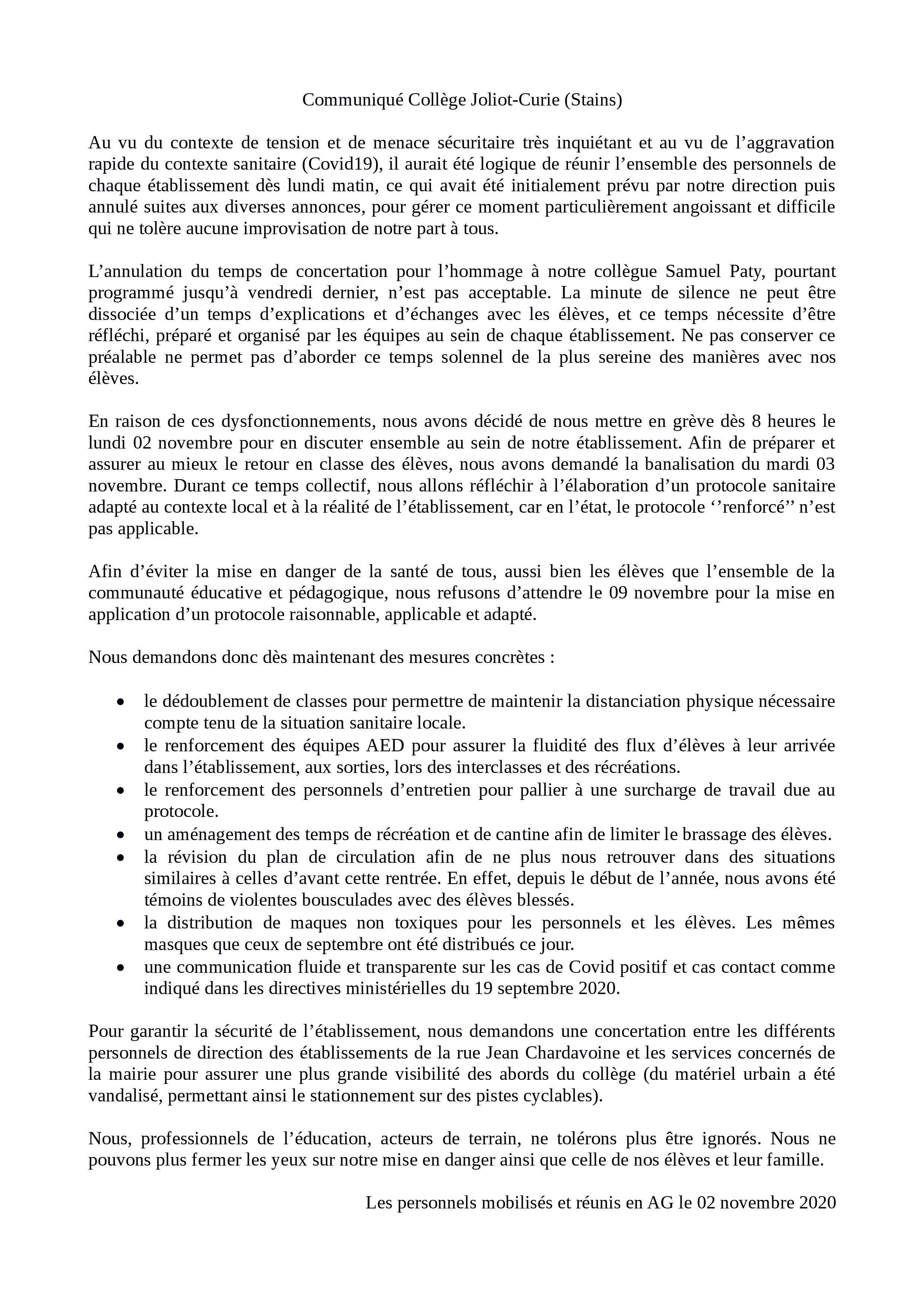 Vous êtes ici : Accueil actu des établissements Seine-Saint-Denis Communiqué des personnels mobilisé.e.s du collège Joliot-Curie (Stains), en grève aujourd’hui - 02.11.2020 2 novembre 2020 actu des établissements Communiqué des personnels mobilisé.e.s du collège Joliot-Curie (Stains), en grève aujourd’hui - 02.11.2020