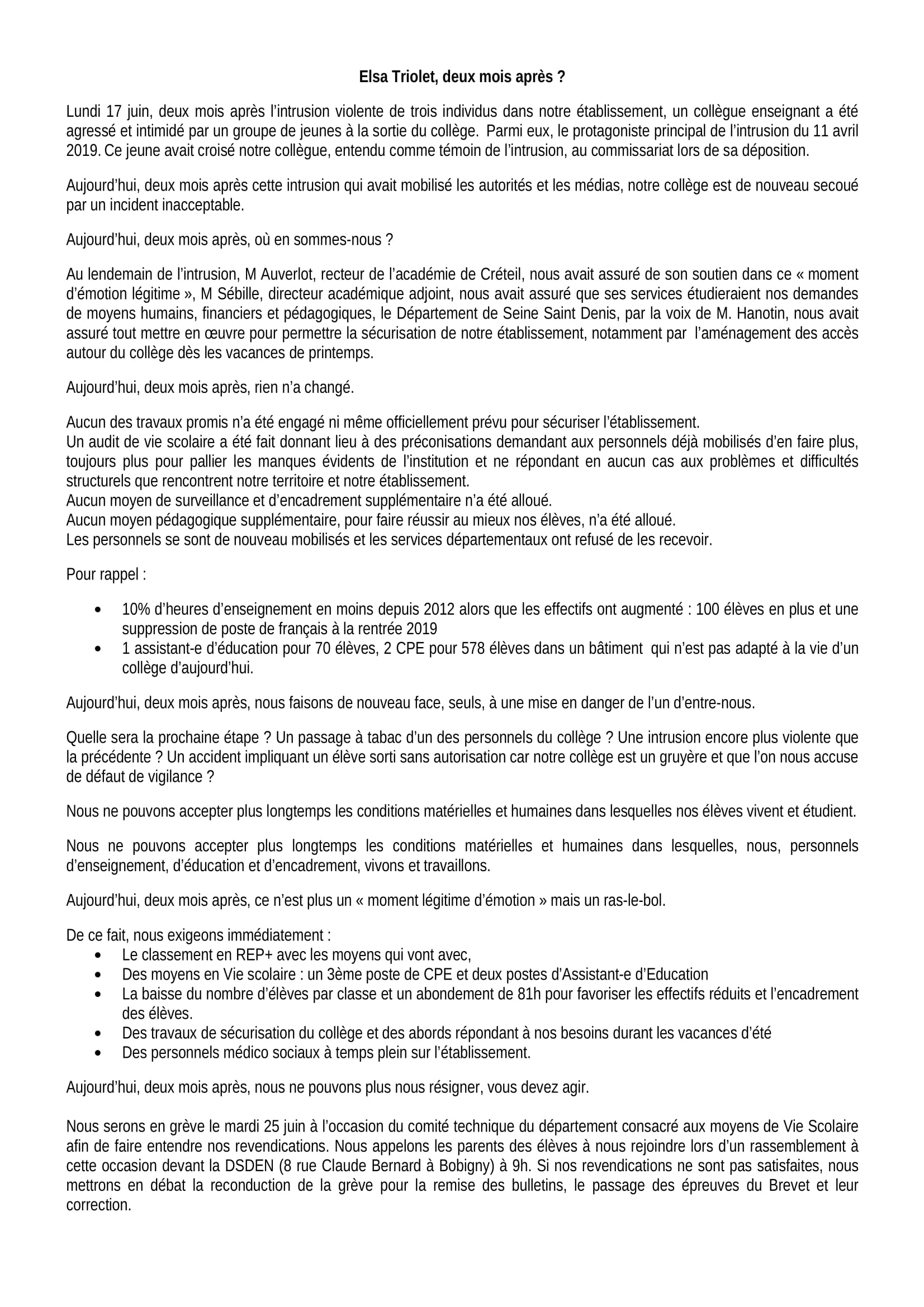 Vous êtes ici : Accueil actu des établissements Seine-Saint-Denis Communiqué du collège Elsa Triolet (Saint-Denis) 22 juin 2019 actu des établissements Communiqué du collège Elsa Triolet (Saint-Denis)