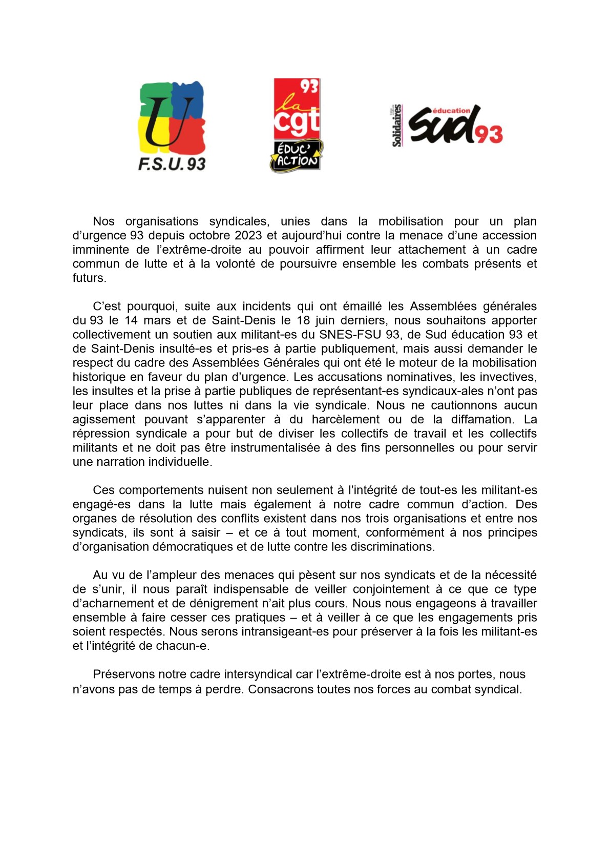 Vous êtes ici : Accueil actu des établissements Seine-Saint-Denis Communiqué intersyndical du 4 juillet 2024 4 juillet 2024 actu des établissements Communiqué intersyndical du 4 juillet 2024
