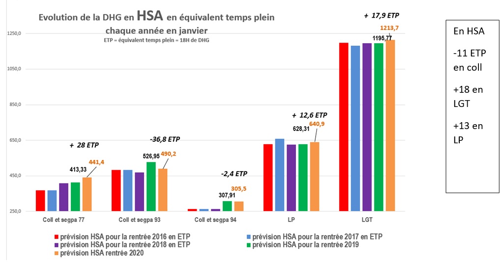 La DHG des lycées de l’académie baisse de 18 ETP ( équivalents temps plein) en heures postes ( 18ETP qui réapparaissent en HSA), pour 1054 élèves prévus en plus ! Alors que les effectifs augmentent de 1100 élèves (la taille d’un lycée de 11 secondes), aucun moyen en plus ! Le ministre et le recteur disaient que la réforme du lycée n’était pas faite pour économiser des moyens : la preuve ! en restant à moyen constant alors qu’il y a plus de 1000 élèves de prévus en lycée, il fait l’économie à Créteil, de l’équivalent de la DHG d’un lycée complet : donc l’équivalent de 80 profs en moyenne !