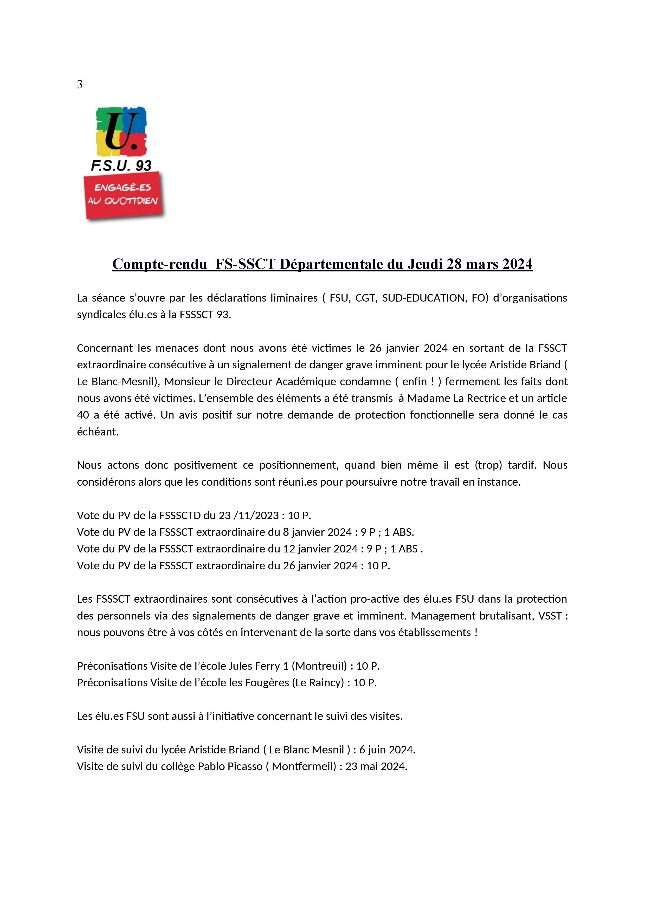 Vous êtes ici : Accueil actu des établissements Seine-Saint-Denis Compte-rendu de la formation spécialisée SST du 28 mars 2024 : il y a encore beaucoup de travail pour la protection des personnels ! 30 avril 2024 actu des établissements Compte-rendu de la formation spécialisée SST du 28 mars 2024 : il y a encore beaucoup de travail pour la protection des personnels !