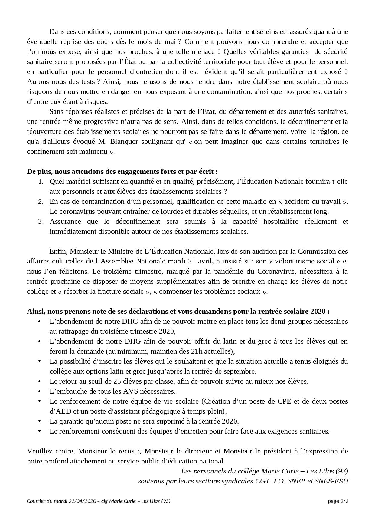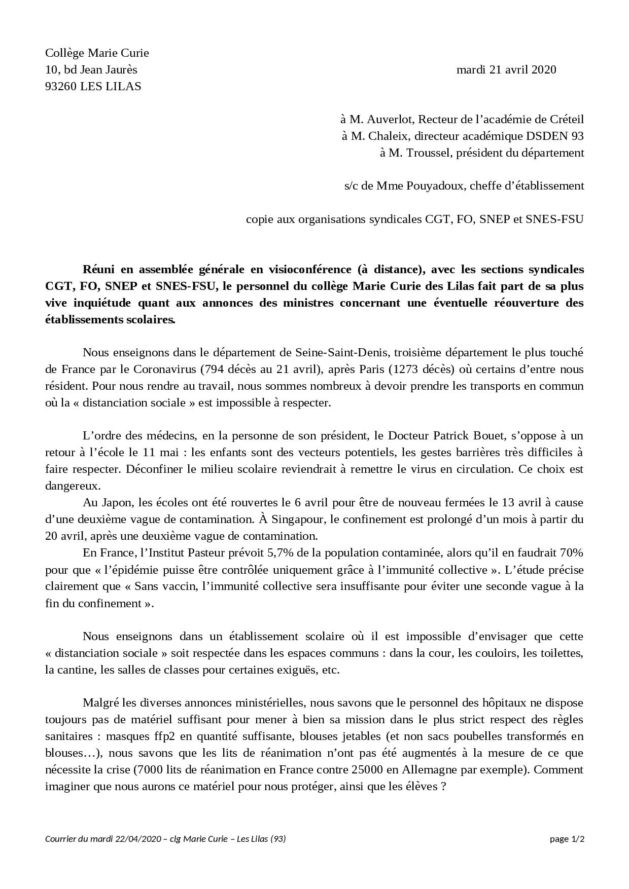 Vous êtes ici : Accueil actu des établissements Seine-Saint-Denis Courrier des personnels du collège Marie Curie (Les Lilas) - 21.04.2020 23 avril 2020 actu des établissements Courrier des personnels du collège Marie Curie (Les Lilas) - 21.04.2020