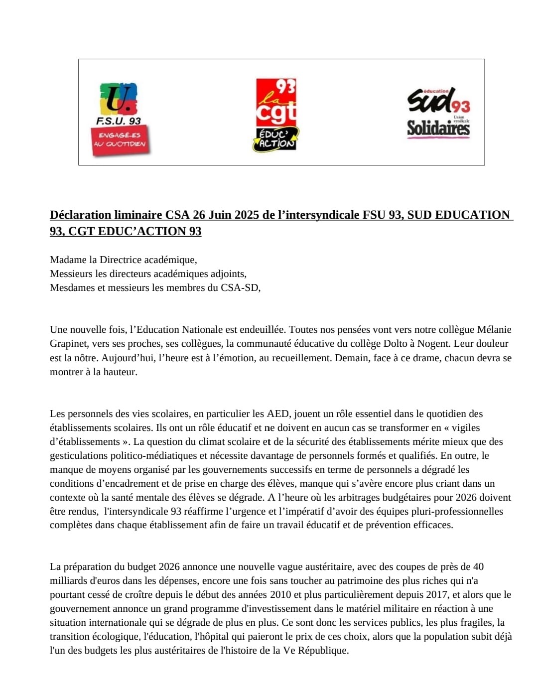 Vous êtes ici : Accueil actu des établissements Seine-Saint-Denis Déclaration liminaire au CSAD du 26 juin de l’intersyndicale FSU 93, Sud Éducation 93 et CGT éduc’action 93 30 juin 2025 actu des établissements Déclaration liminaire au CSAD du 26 juin de l’intersyndicale FSU 93, Sud Éducation 93 et CGT éduc’action 93