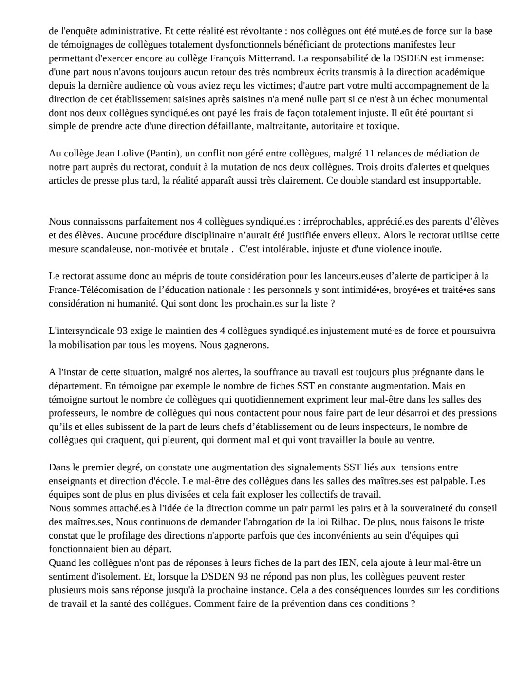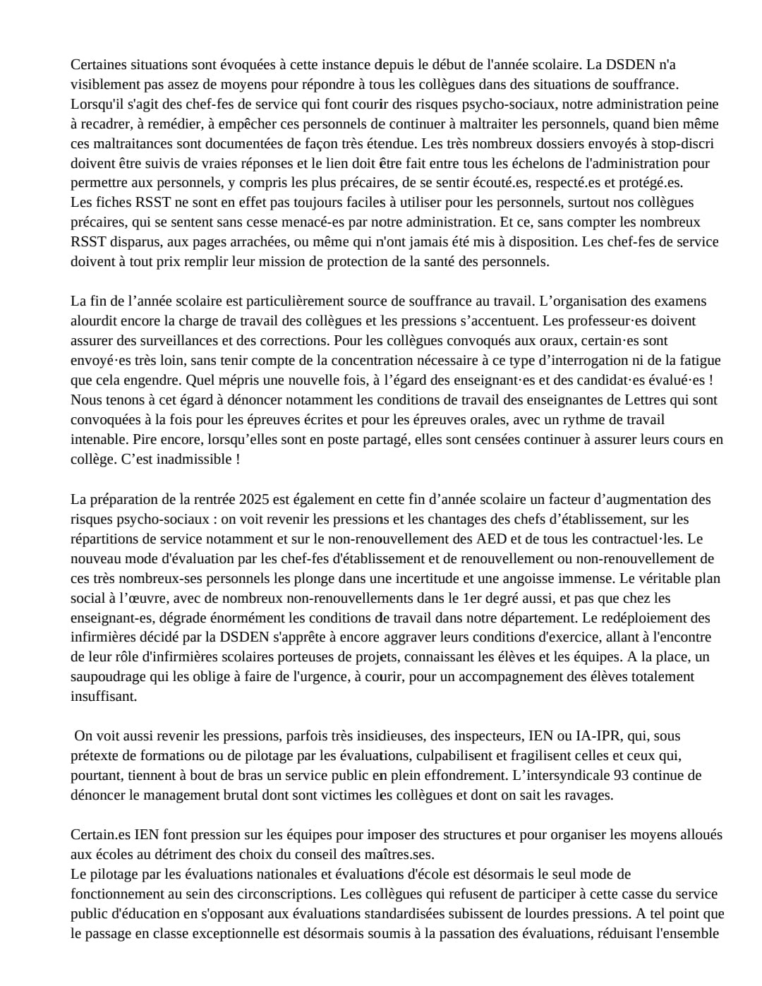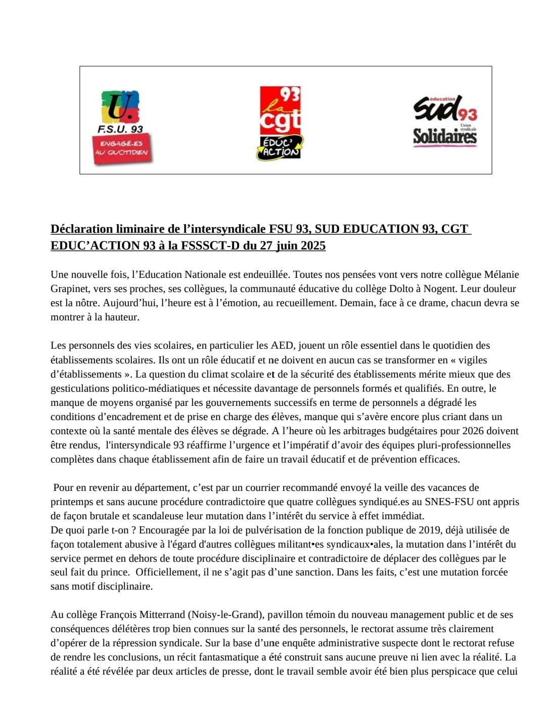 Vous êtes ici : Accueil actu des établissements Seine-Saint-Denis Déclaration liminaire de l’intersyndicale FSU 93, SUD Education 93, CGT Educ’action 93 à a FSSSCT-D du 27 juin 2025 1er juillet 2025 actu des établissements Déclaration liminaire de l’intersyndicale FSU 93, SUD Education 93, CGT Educ’action 93 à a FSSSCT-D du 27 juin 2025