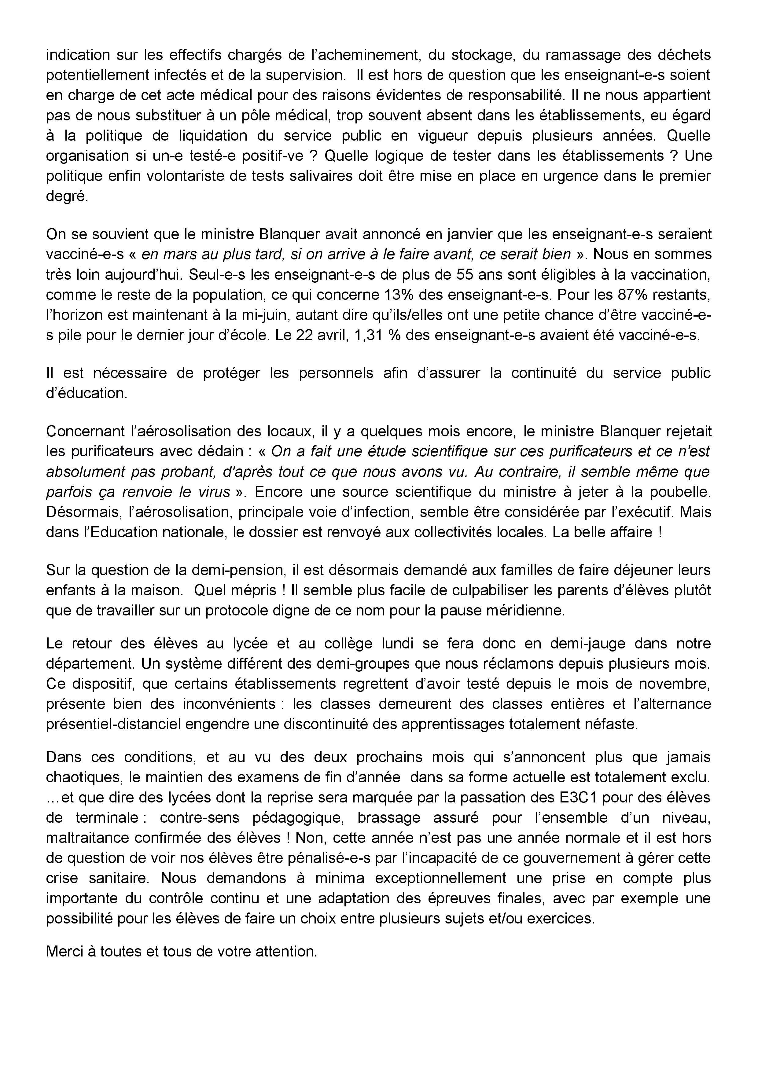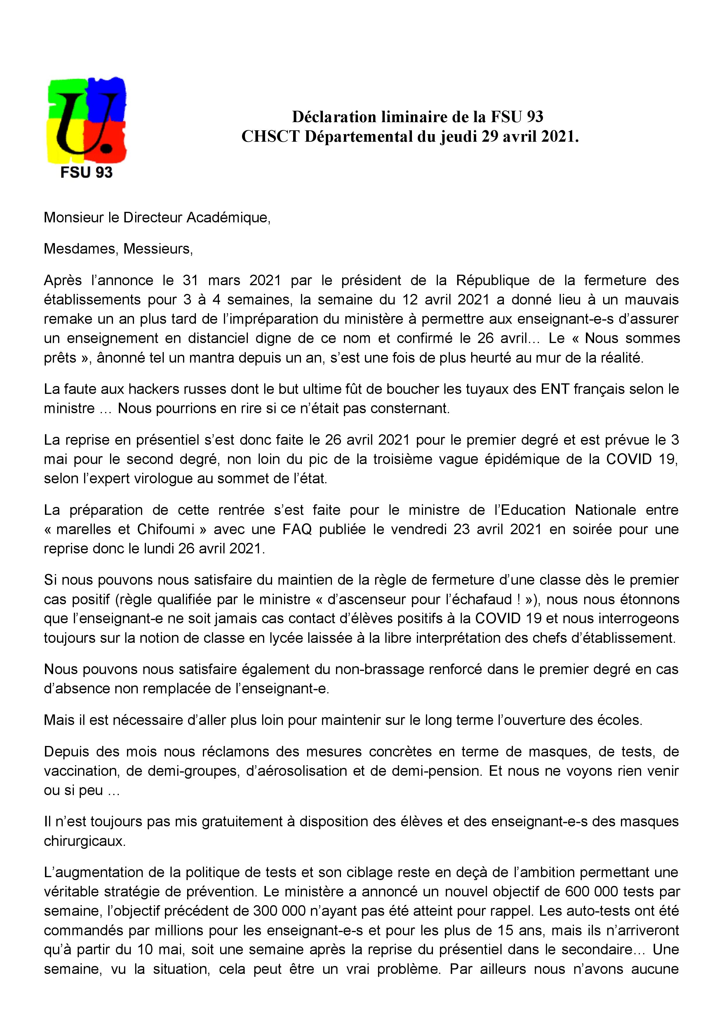 Vous êtes ici : Accueil actu des établissements Seine-Saint-Denis Déclaration liminaire de la FSU 93 : Avis... 29 avril 2021 actu des établissements Déclaration liminaire de la FSU 93 : Avis... Déclaration liminaire de la FSU 93 : Avis proposés par la FSU 93 et votés à l’unanimité en séance