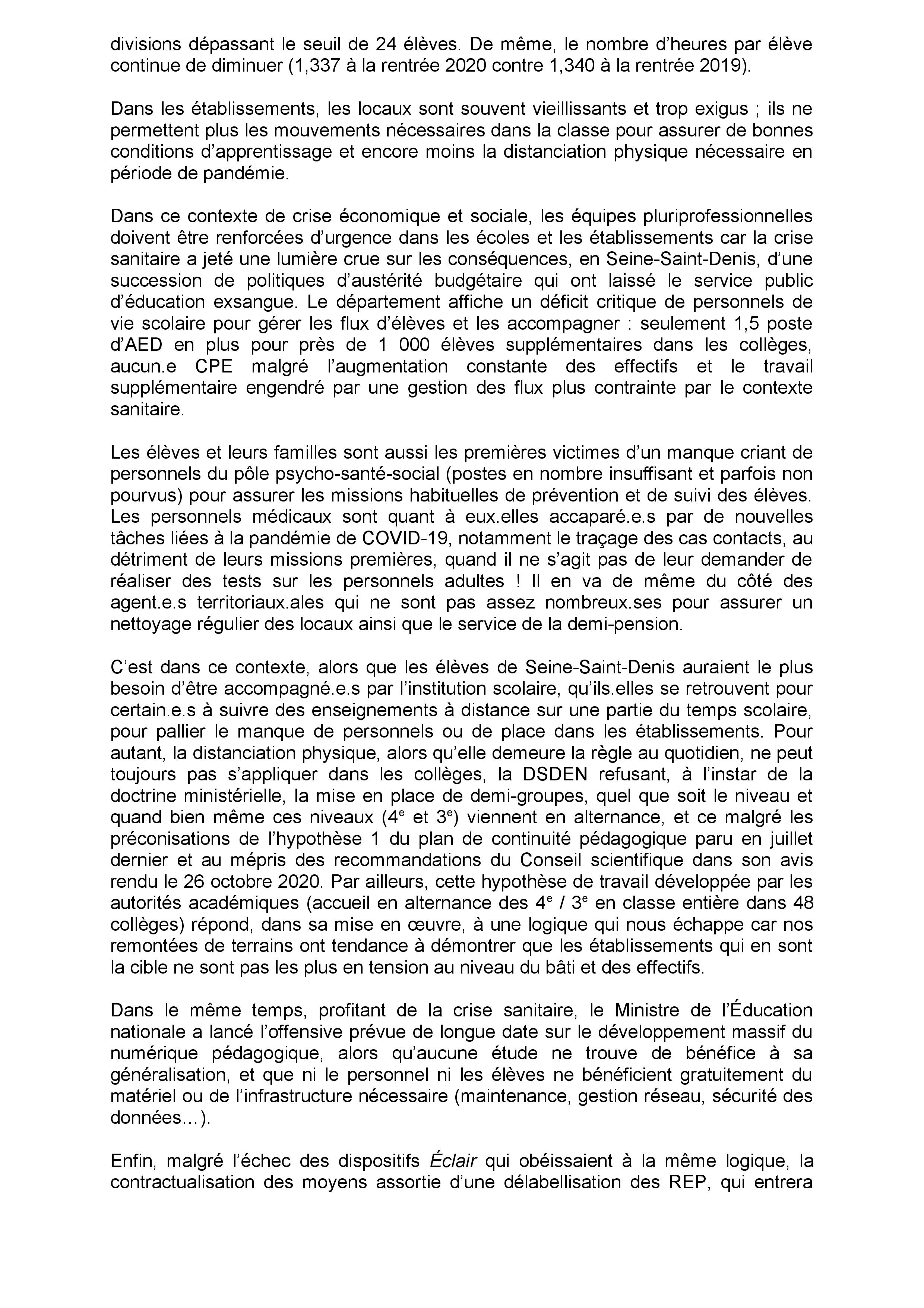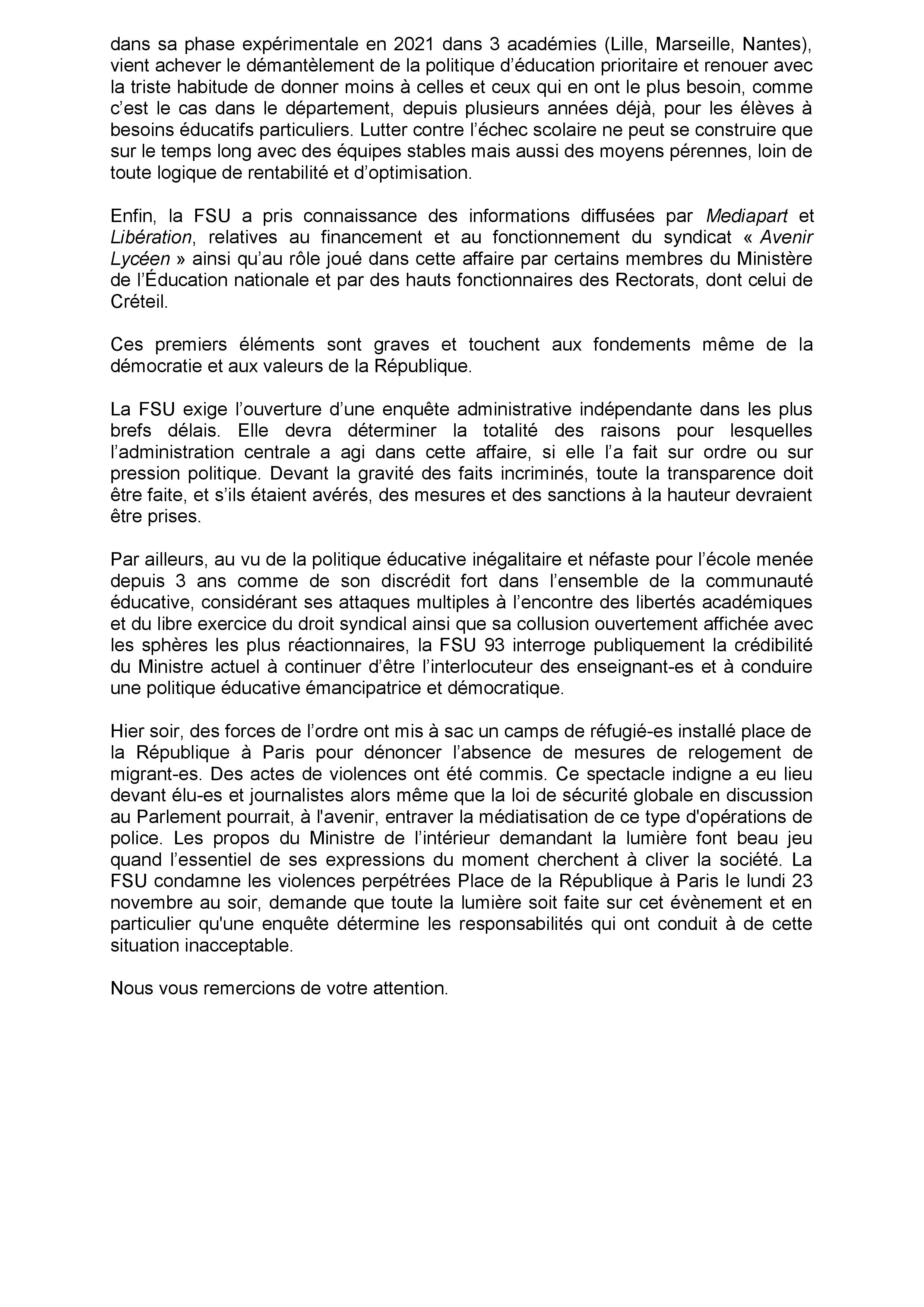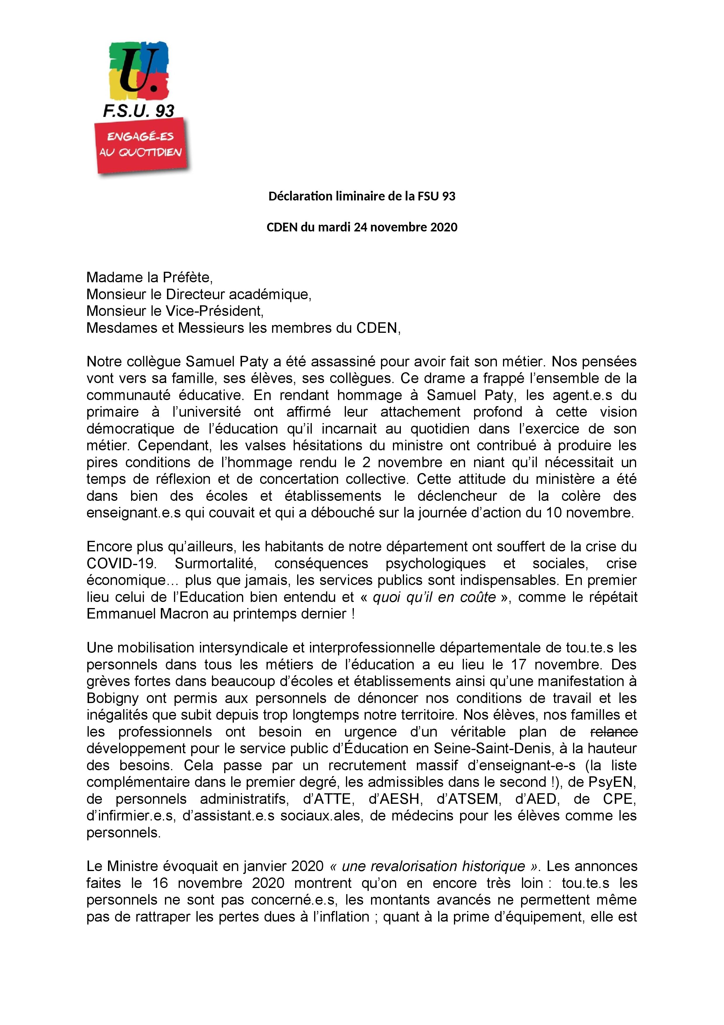 Vous êtes ici : Accueil actu des établissements Seine-Saint-Denis Déclaration liminaire de la FSU 93 - CDEN du 24.11.2020 6 décembre 2020 actu des établissements Déclaration liminaire de la FSU 93 - CDEN du 24.11.2020