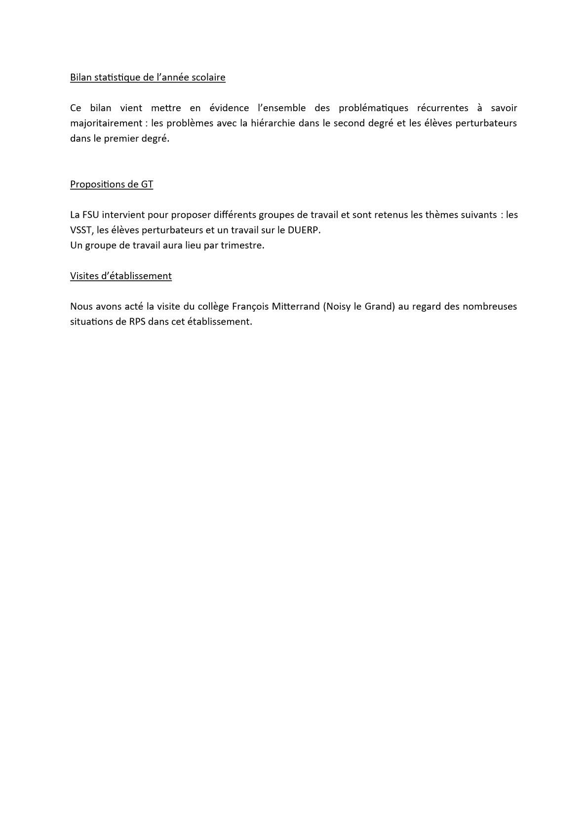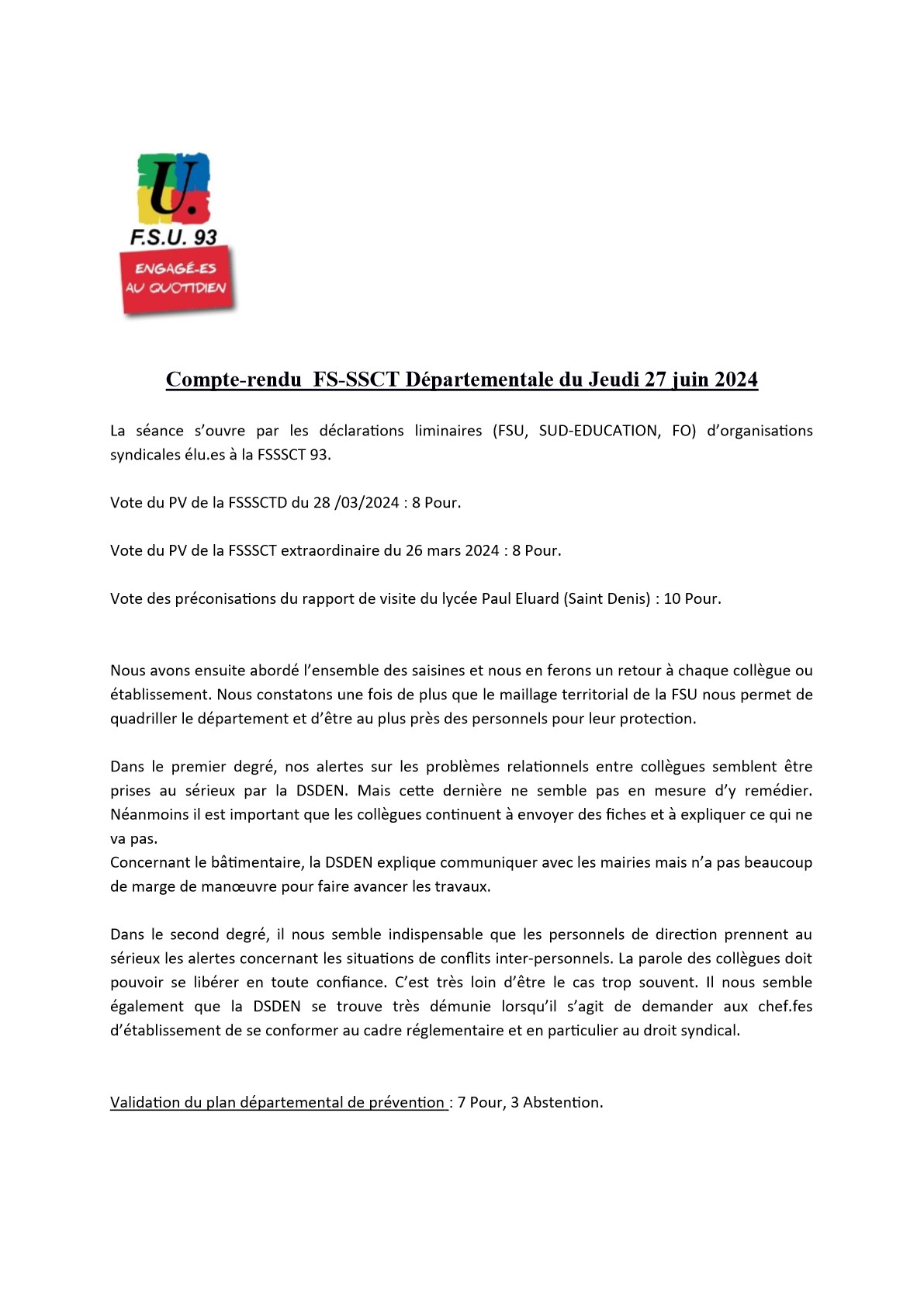 Vous êtes ici : Accueil actu des établissements Seine-Saint-Denis Déclaration liminaire de la FSU 93 à la formation spécialisée en sécurité et conditions de travail du 27 juin+Compte-rendu 2 juillet 2024 actu des établissements Déclaration liminaire de la FSU 93 à la formation spécialisée en sécurité et conditions de travail du 27 juin+Compte-rendu