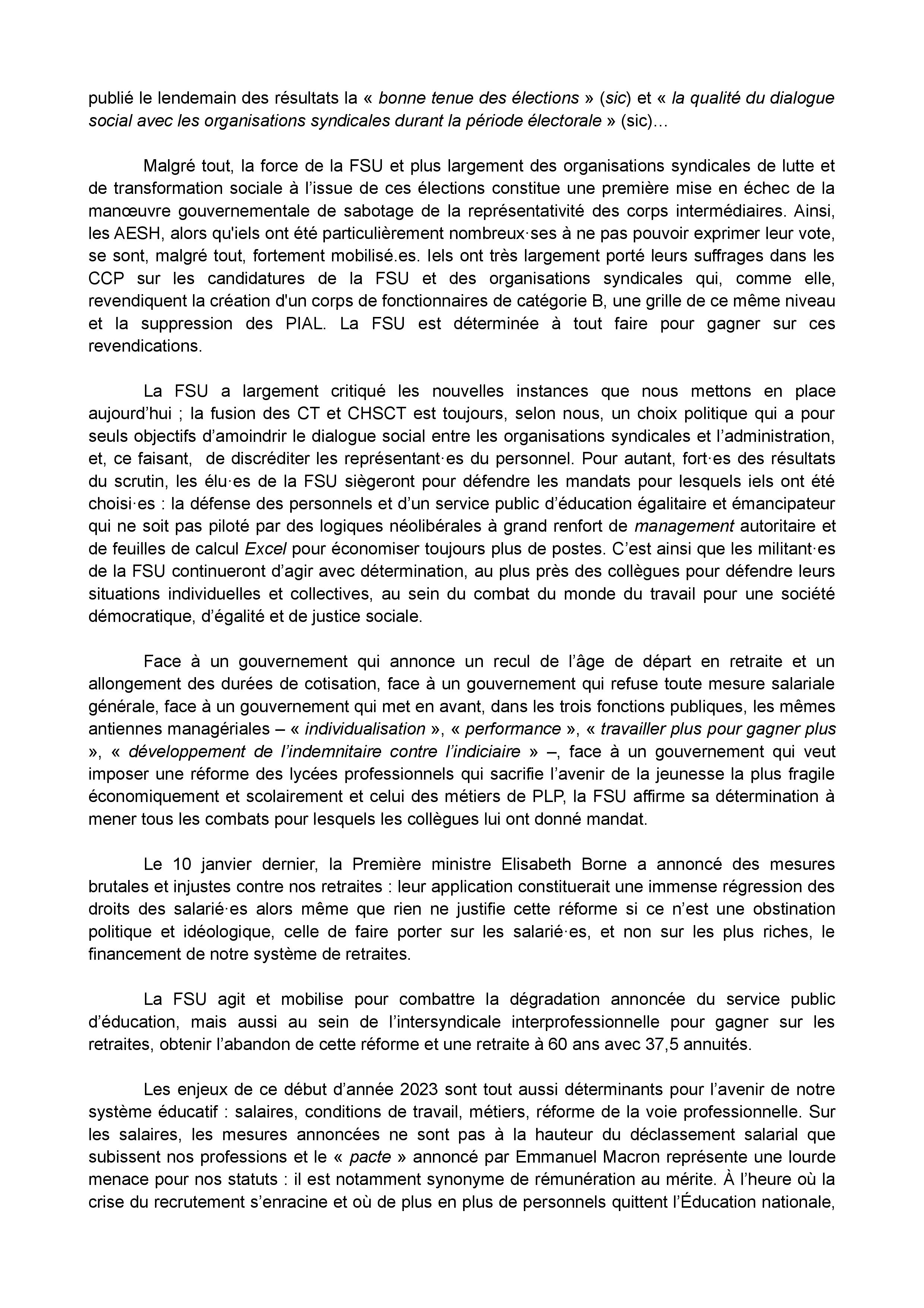 Vous êtes ici : Accueil actu des établissements Seine-Saint-Denis Déclaration liminaire de la FSU 93 lue en séance lors du CSA spécial départemental d’installation du 18 janvier 2023 23 janvier 2023 actu des établissements Déclaration liminaire de la FSU 93 lue en séance lors du CSA spécial départemental d’installation du 18 janvier 2023