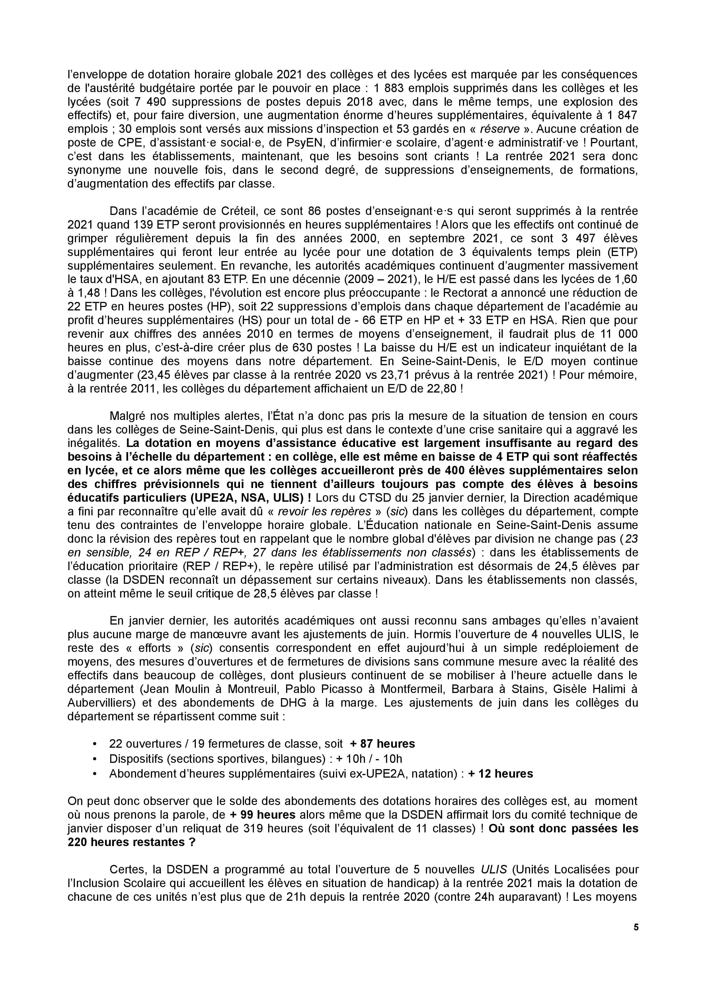 Vous êtes ici : Accueil actu des établissements Seine-Saint-Denis Déclaration liminaire du SNES-FSU 93 et voeu intersyndical adopté en séance 29 juin 2021 actu des établissements Déclaration liminaire du SNES-FSU 93 et voeu intersyndical adopté en séance CTSD ajustements 2d degré - 28.06.2021