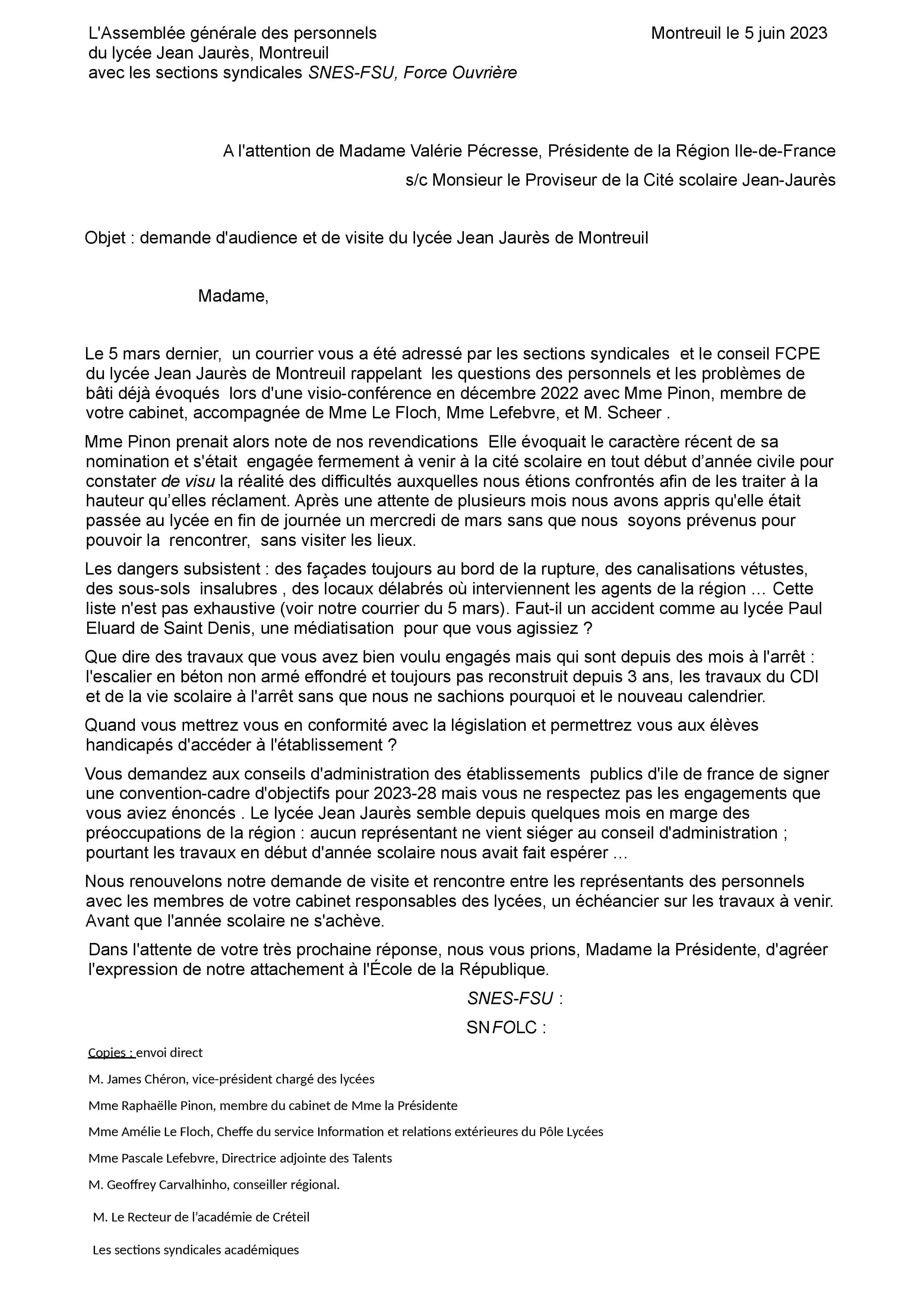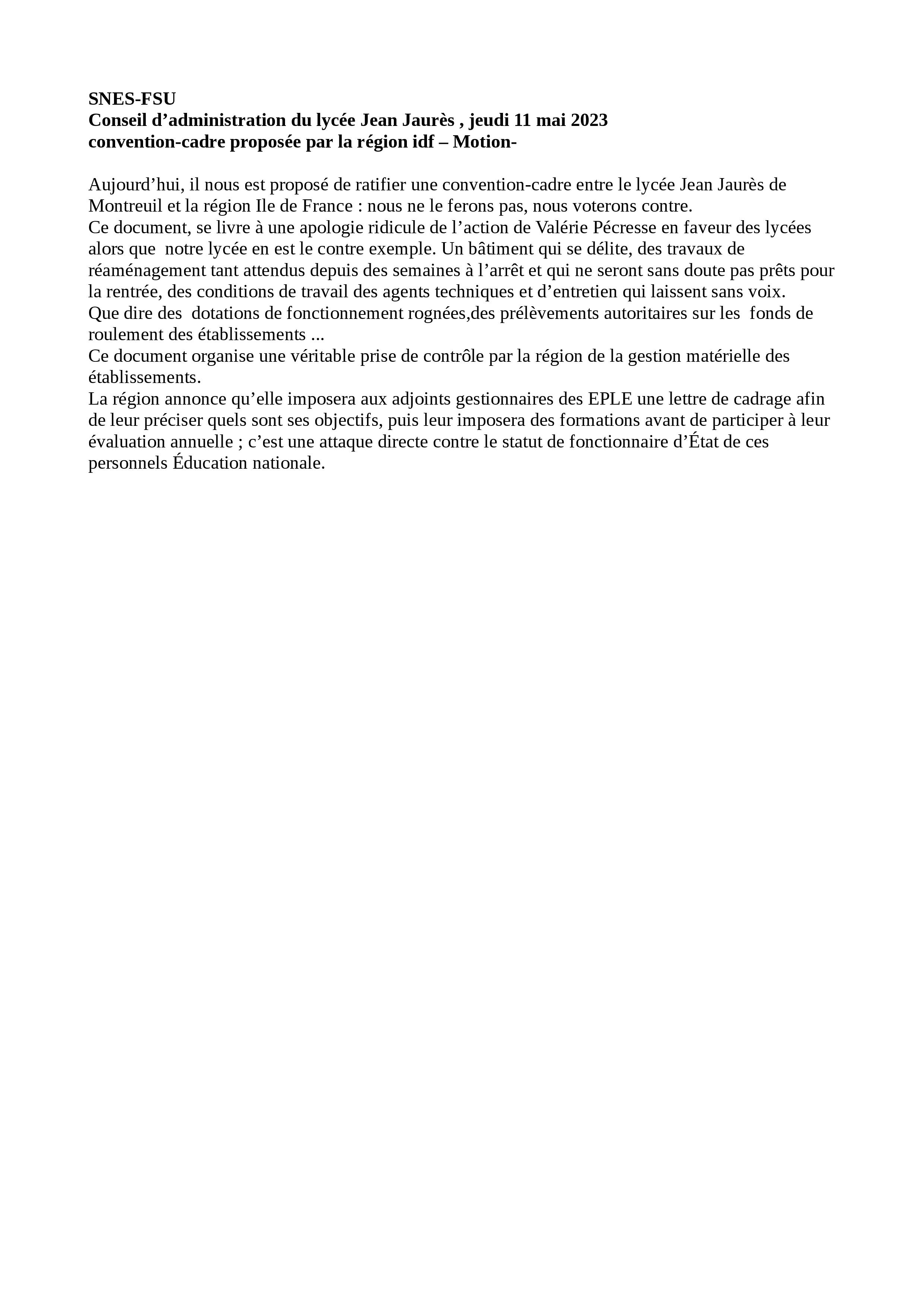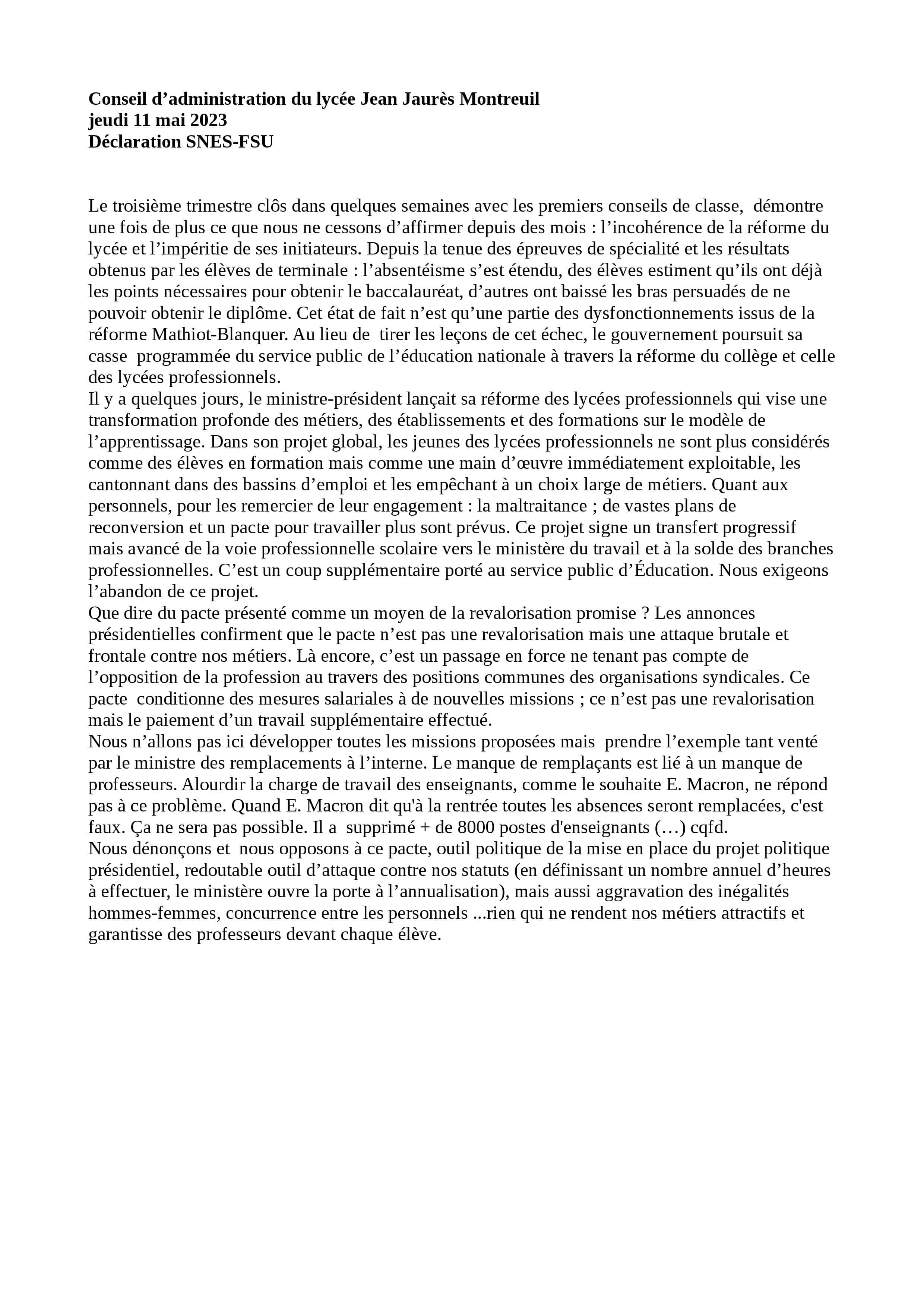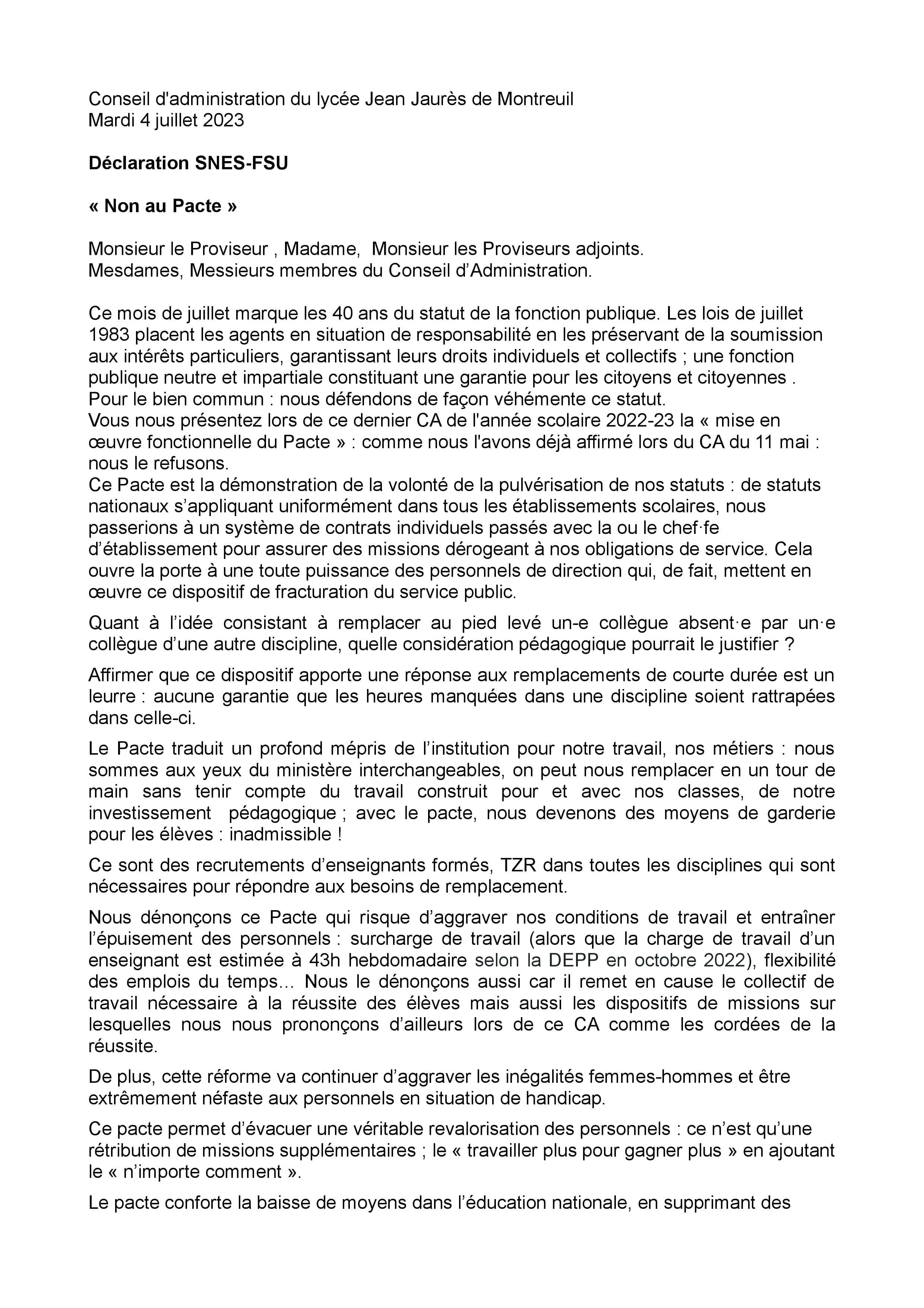 Vous êtes ici : Accueil actu des établissements Seine-Saint-Denis Déclarations, courrier et motions du Snes-FSU au CA du lycée Jean Jaurès (Montreuil) 10 juillet 2023 actu des établissements Déclarations, courrier et motions du Snes-FSU au CA du lycée Jean Jaurès (Montreuil) Motions et courrier transmis durant les mois de mai et juin 2023.