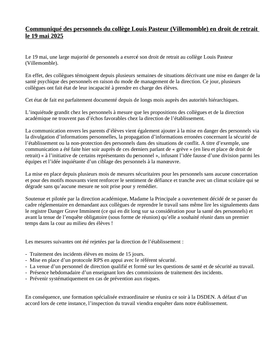 Vous êtes ici : Accueil actu des établissements Seine-Saint-Denis Droit de retrait au collège Louis Pasteur (Villemomble) 20 mai 2025 actu des établissements Droit de retrait au collège Louis Pasteur (Villemomble)