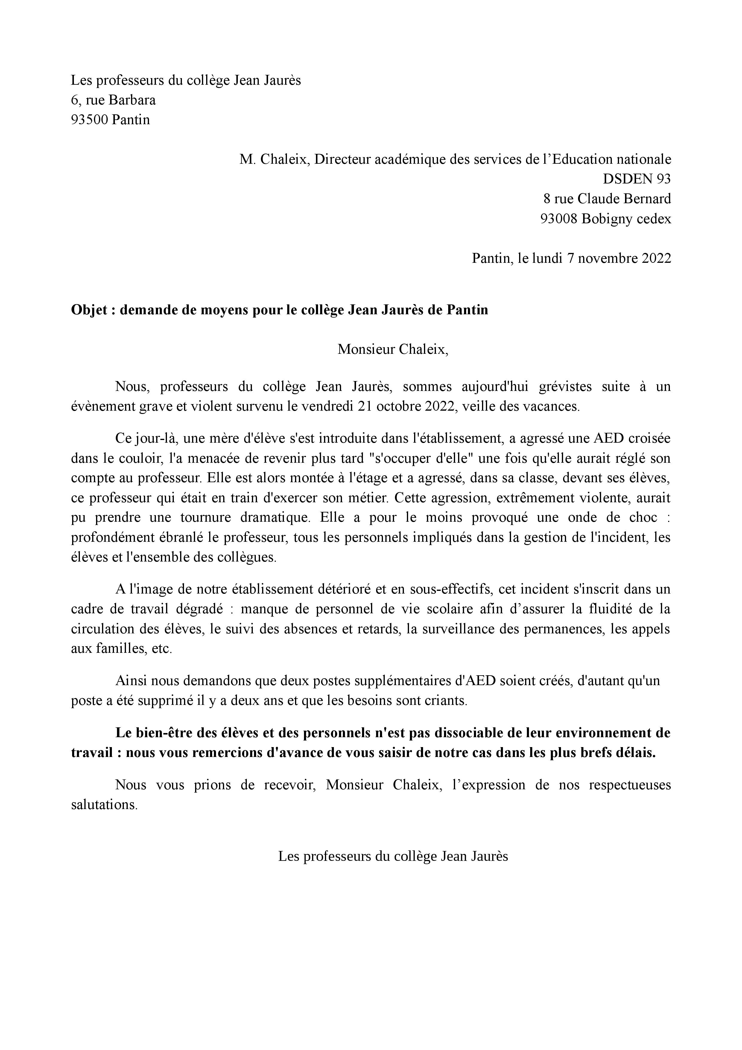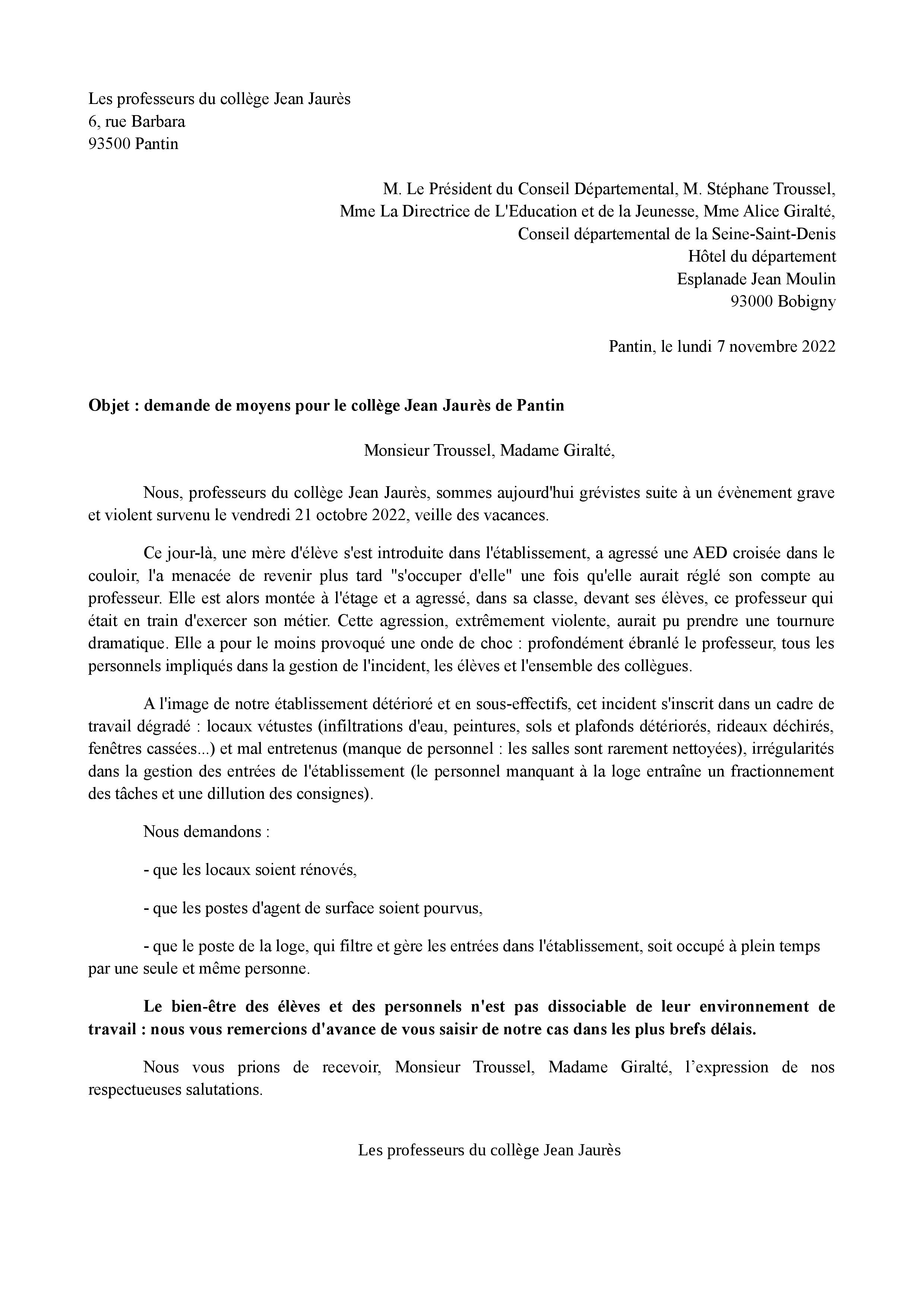 - Grève au collège Jean Jaurès (Pantin) : les enseignant·es interpellent les autorités académiques et le conseil départemental sur la dégradation de leurs conditions de travail !