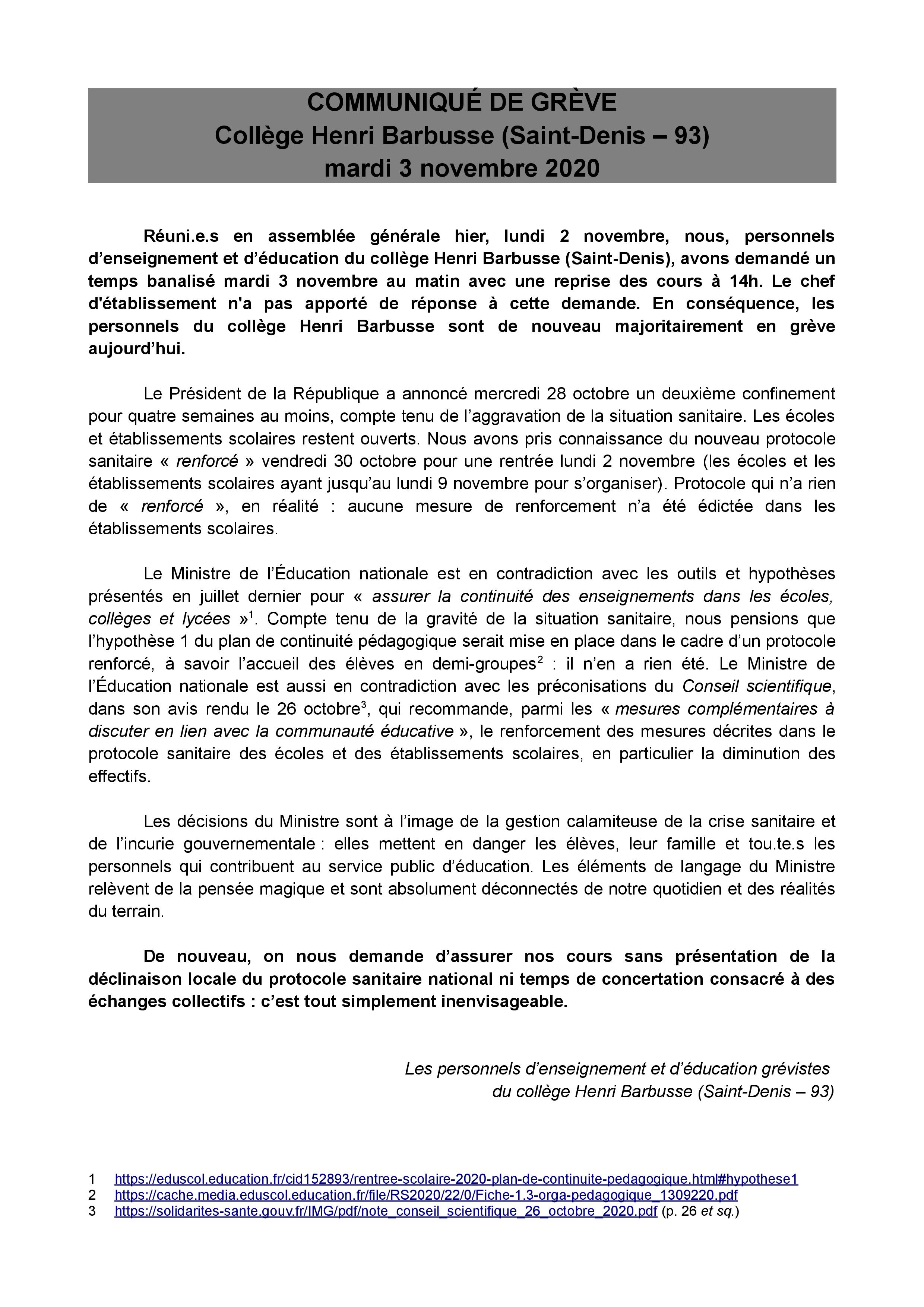 Vous êtes ici : Accueil actu des établissements Seine-Saint-Denis Grève reconduite au collège Henri Barbusse (Saint-Denis) ! Communiqué de presse des personnels grévistes - 03.11.2020 3 novembre 2020 actu des établissements Grève reconduite au collège Henri Barbusse (Saint-Denis) ! Communiqué de presse des personnels grévistes - 03.11.2020