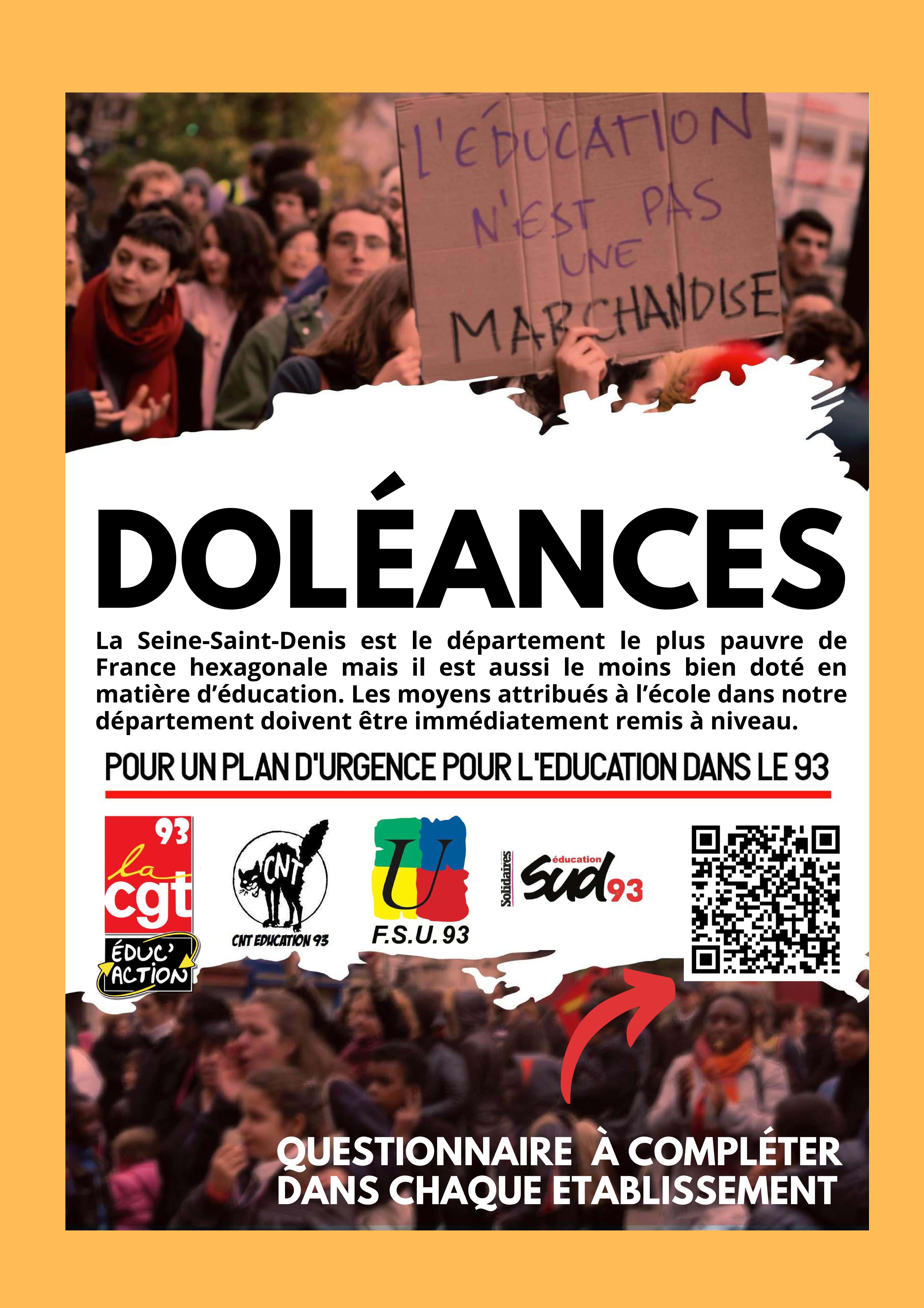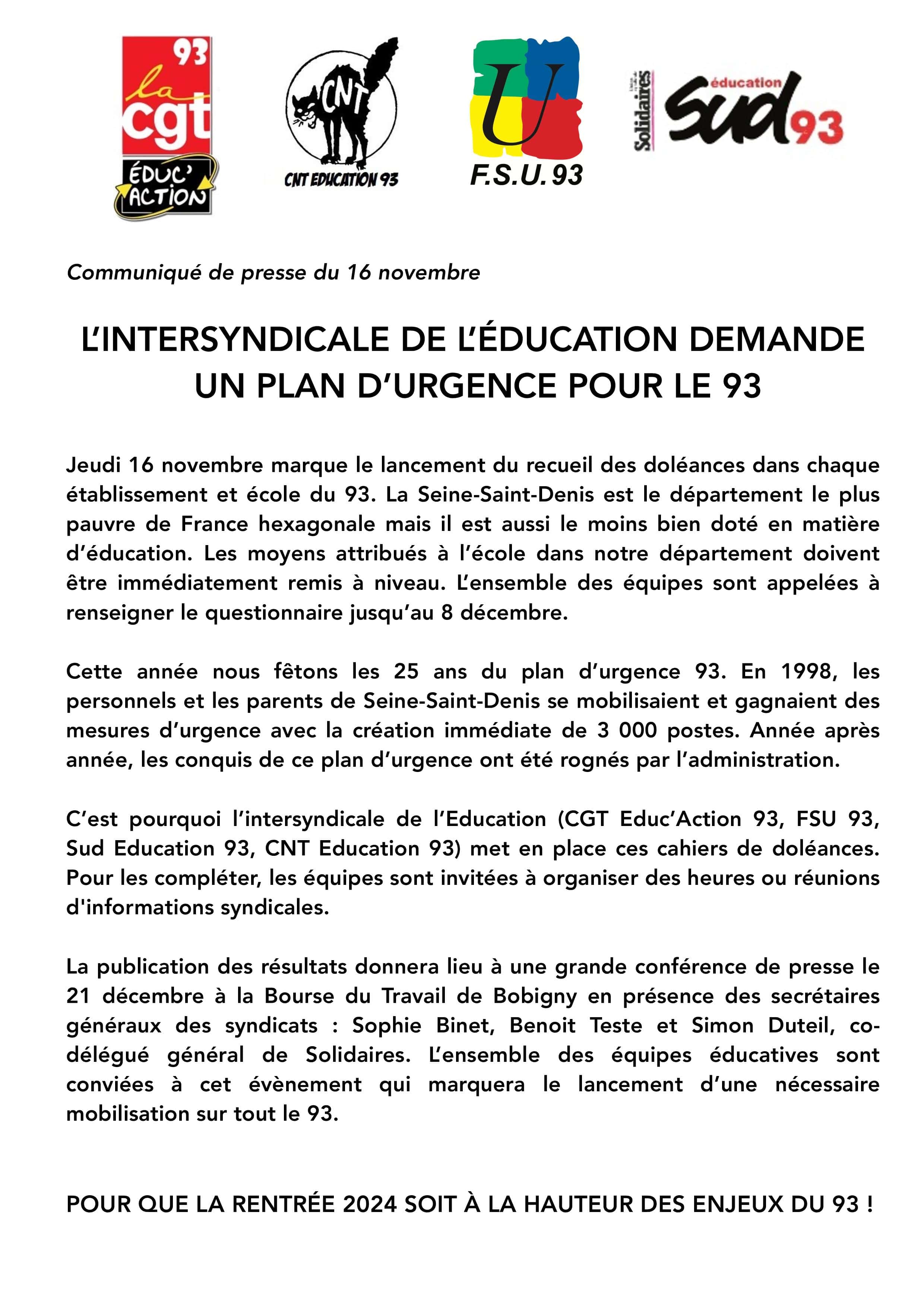Vous êtes ici : Accueil actu des établissements Seine-Saint-Denis Pour que la rentrée 2024 soit à la hauteur des enjeux du 93 ! 16 novembre 2023 actu des établissements Pour que la rentrée 2024 soit à la hauteur des enjeux du 93 ! L’intersyndicale demande un plan d’urgence pour l’éducation en Seine-Saint-Denis !