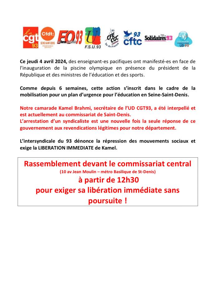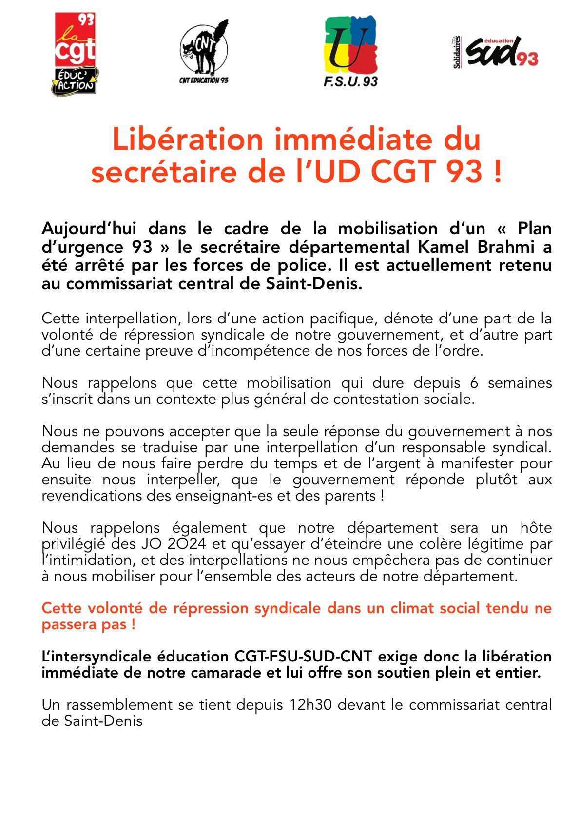 Vous êtes ici : Accueil actu des établissements Seine-Saint-Denis L’intersyndicale et les UD 93 dénoncent la répression à l’encontre de Kamel Brahmi (secrétaire de l’UD CGT 93) ! 5 avril 2024 actu des établissements L’intersyndicale et les UD 93 dénoncent la répression à l’encontre de Kamel Brahmi (secrétaire de l’UD CGT 93) !