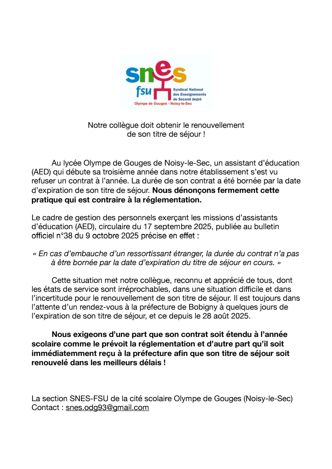 Vous êtes ici : Accueil actu des établissements Seine-Saint-Denis La cité scolaire Olympe de Gouges (Noisy-le-sec) se mobilise pour la situation d’un AED 10 novembre 2025 actu des établissements La cité scolaire Olympe de Gouges (Noisy-le-sec) se mobilise pour la situation d’un AED Communiqué de presse de la section SNES-FSU de la cité scolaire Olympe de Gouges (Noisy-le-Sec).
