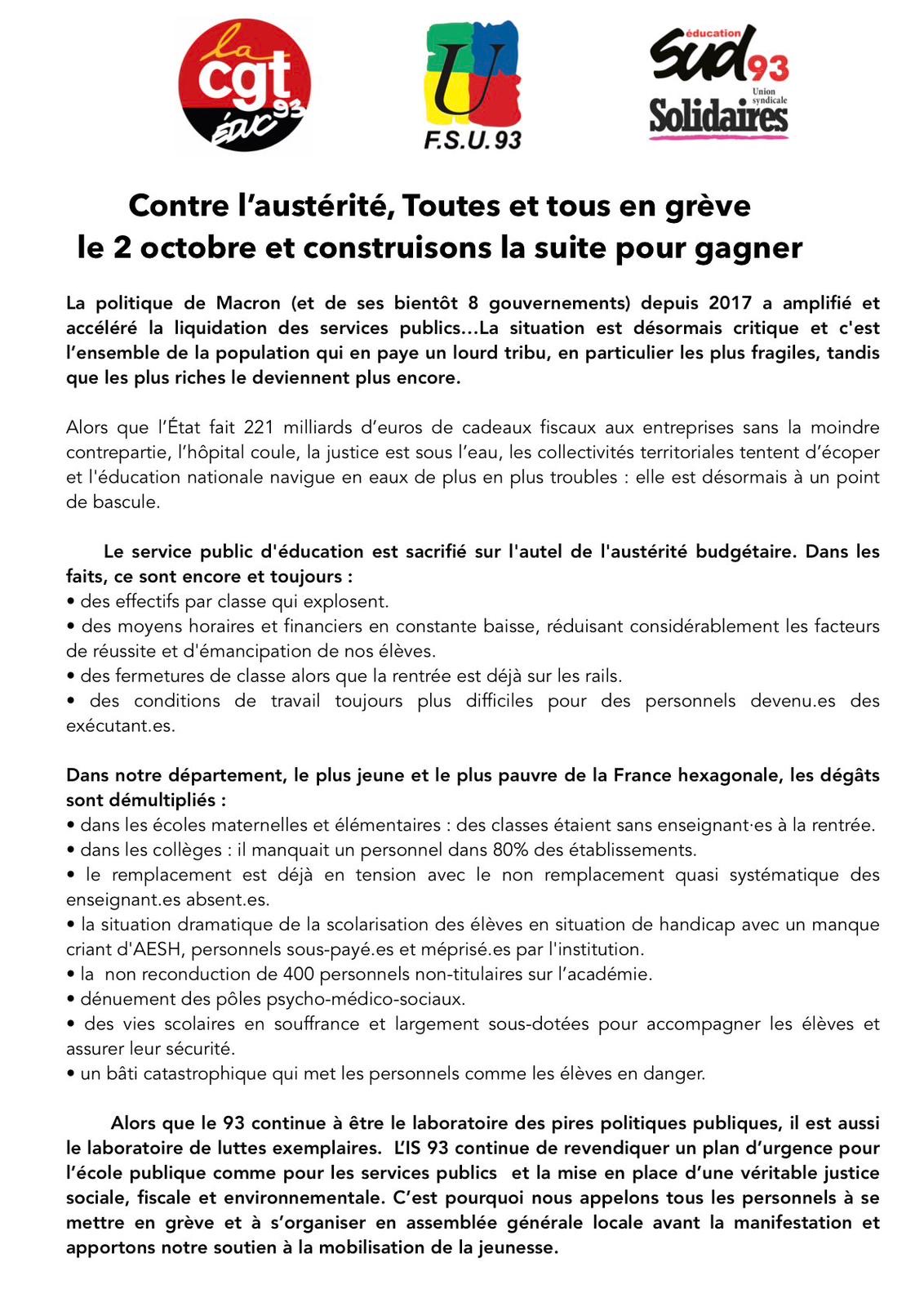 Vous êtes ici : Accueil actu des établissements Seine-Saint-Denis Le 2 octobre et après, le 93 toujours en lutte 26 septembre 2025 actu des établissements Le 2 octobre et après, le 93 toujours en lutte Communiqué de l’intersyndicale 93.