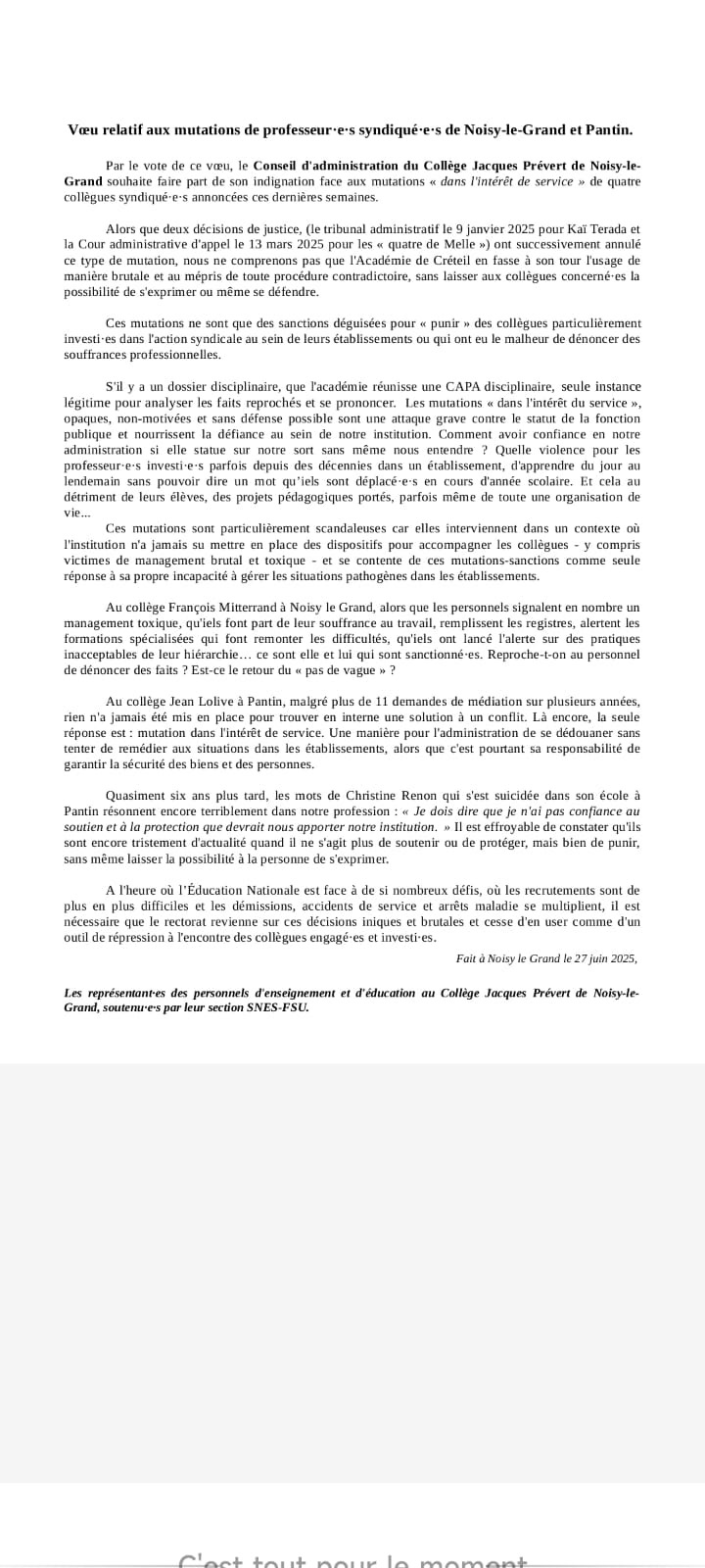 Vous êtes ici : Accueil actu des établissements Seine-Saint-Denis Le CA du collège Jacques Prévert (Noisy-le-Grand) en soutien aux collègues muté.es de force 3 juillet 2025 actu des établissements Le CA du collège Jacques Prévert (Noisy-le-Grand) en soutien aux collègues muté.es de force