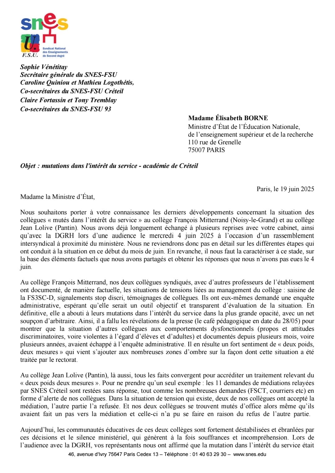 Vous êtes ici : Accueil actu des établissements Seine-Saint-Denis Le SNES-FSU s’adresse au ministère : il faut annuler les mutations forcées de nos collègues syndiqué.es 22 juin 2025 actu des établissements Le SNES-FSU s’adresse au ministère : il faut annuler les mutations forcées de nos collègues syndiqué.es Lettre ouverte du SNES-FSU à Elisabeth Borne, ministre de l’Education nationale.