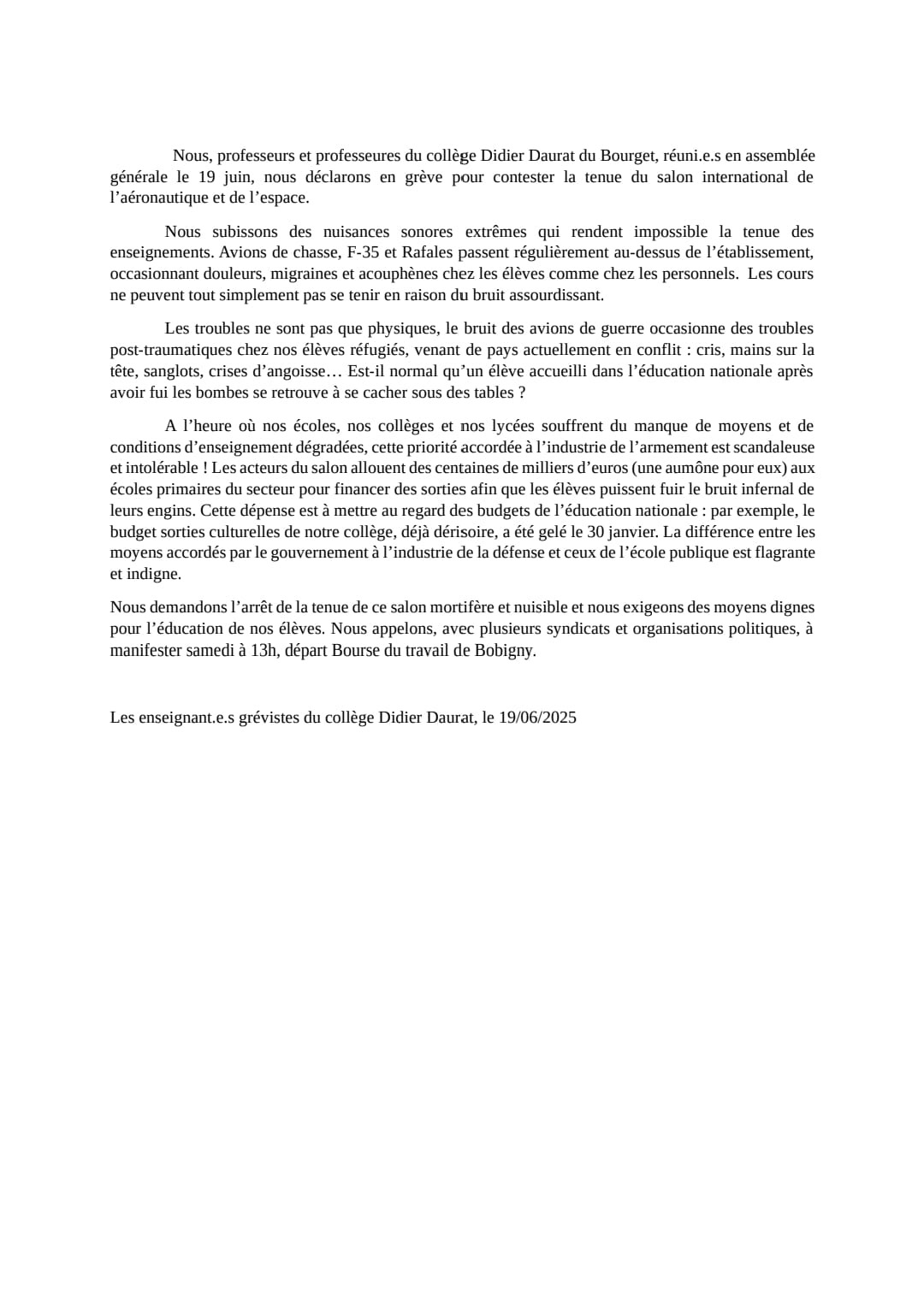Vous êtes ici : Accueil actu des établissements Seine-Saint-Denis Le collège Didier Daurat (Le Bourget) s’oppose au salon du Bourget 20 juin 2025 actu des établissements Le collège Didier Daurat (Le Bourget) s’oppose au salon du Bourget