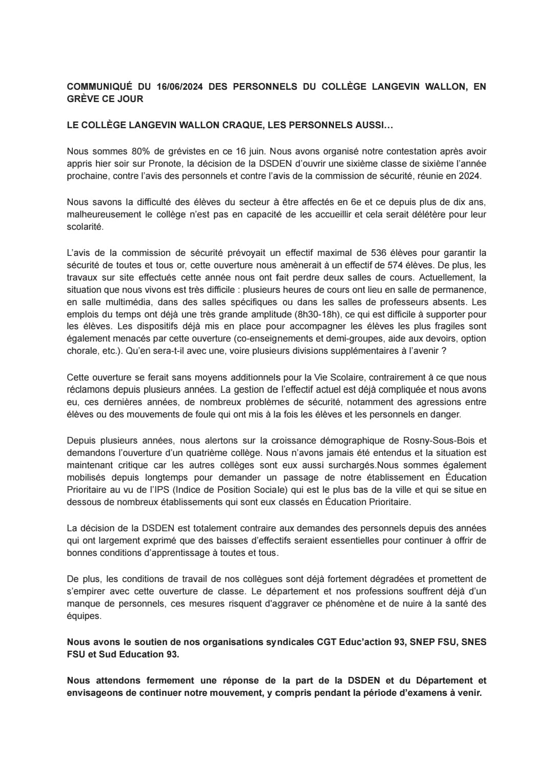 Vous êtes ici : Accueil actu des établissements Seine-Saint-Denis Le collège Langevin Wallon (Rosny sous bois) craque : 80% des personnels en grève aujourd’hui 16 juin 2025 actu des établissements Le collège Langevin Wallon (Rosny sous bois) craque : 80% des personnels en grève aujourd’hui
