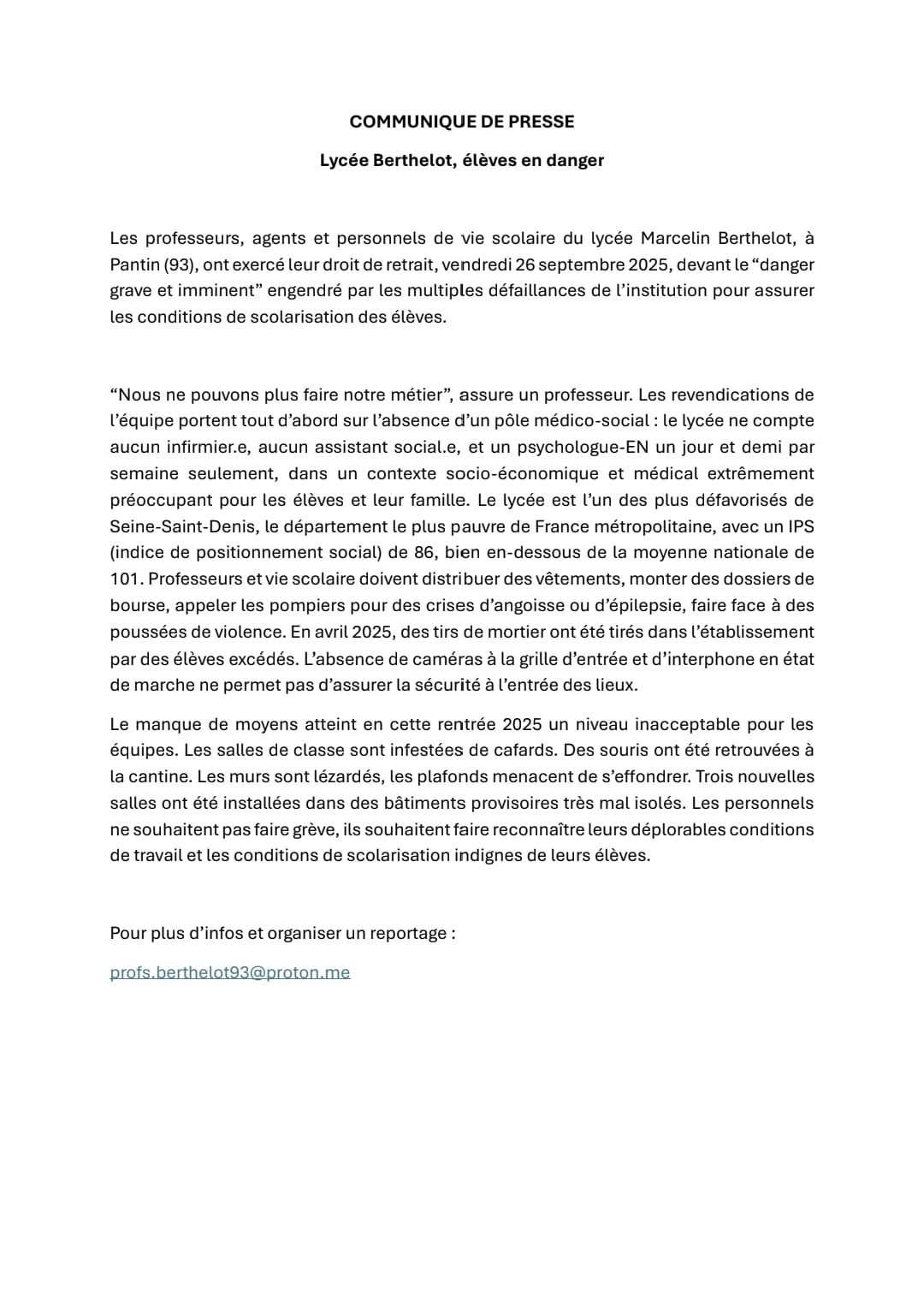 Vous êtes ici : Accueil actu des établissements Seine-Saint-Denis Le lycée Berthelot (Pantin) à l’agonie 26 septembre 2025 actu des établissements Le lycée Berthelot (Pantin) à l’agonie Communiqué de presse des personnels du lycée M. Berthelot de Pantin.