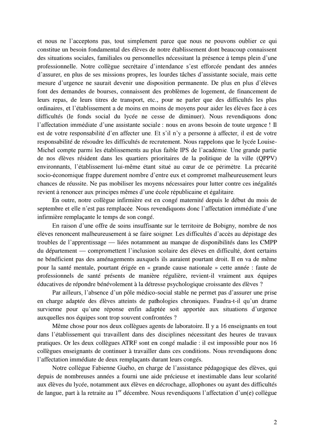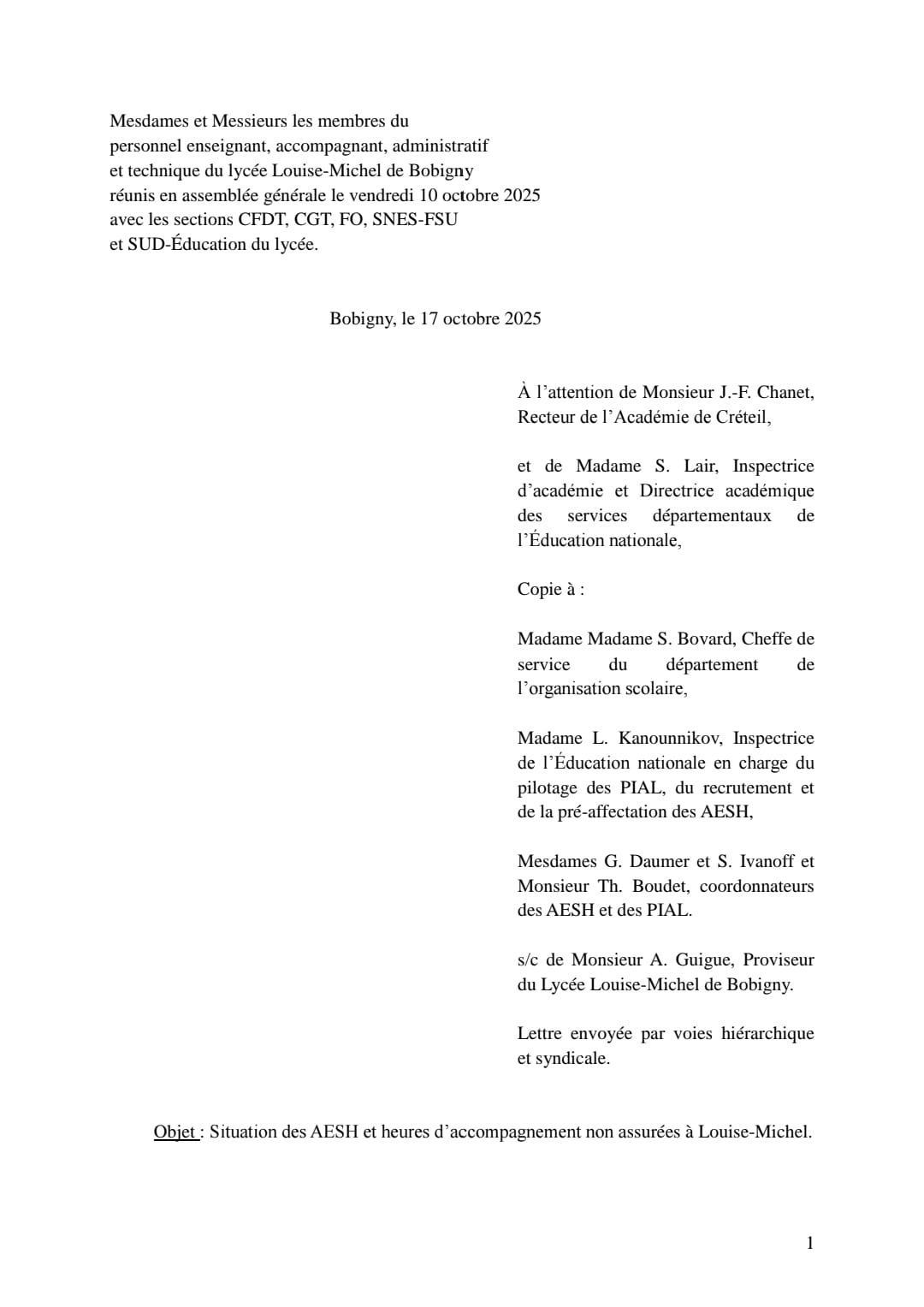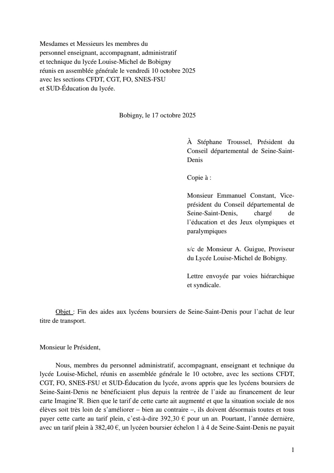 Vous êtes ici : Accueil actu des établissements Seine-Saint-Denis Le lycée Louise Michel (Bobigny) en lutte contre le démantèlement du service public 17 novembre 2025 actu des établissements Le lycée Louise Michel (Bobigny) en lutte contre le démantèlement du service public Courrier des personnels au recteur et à la DASEN 93.