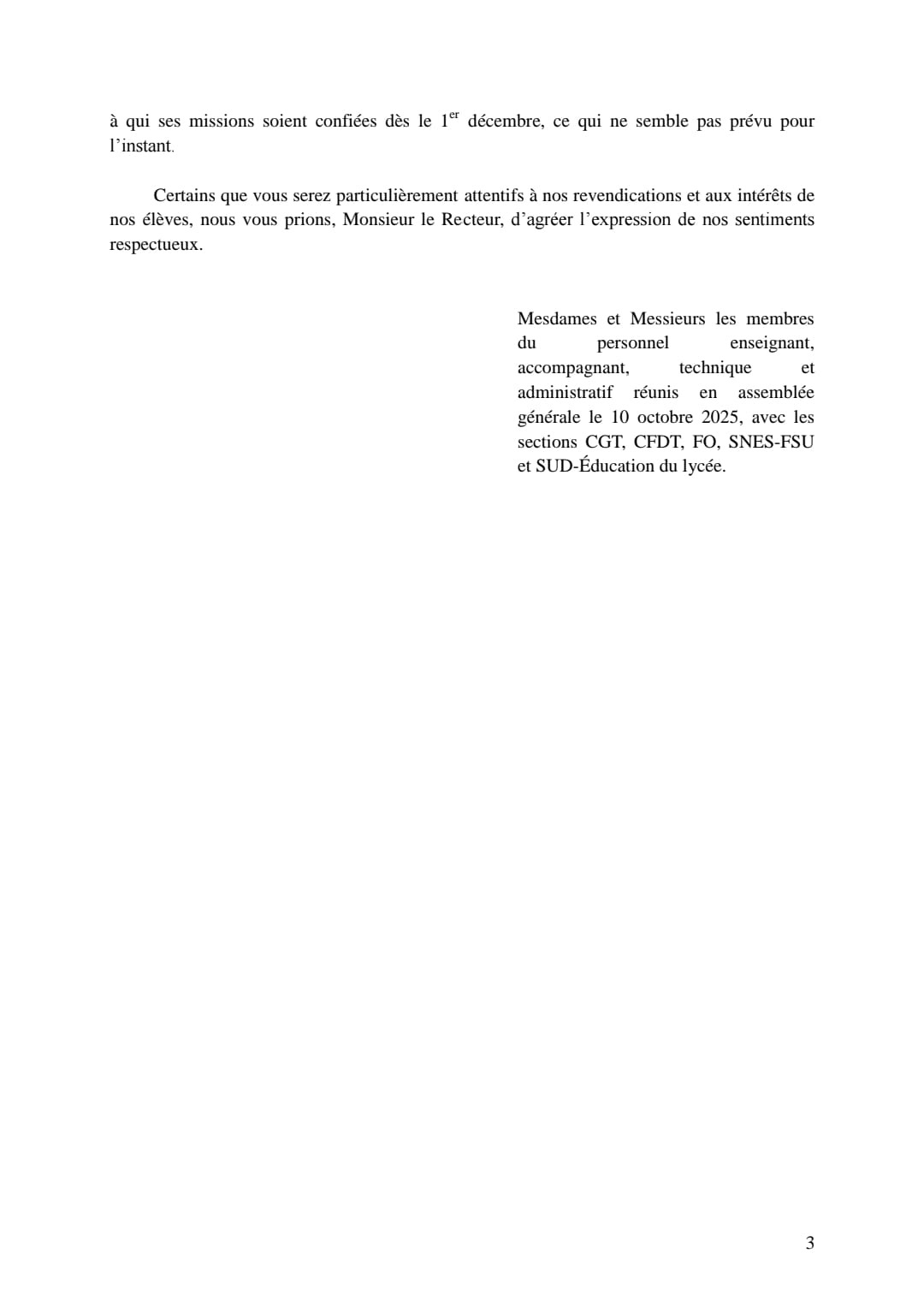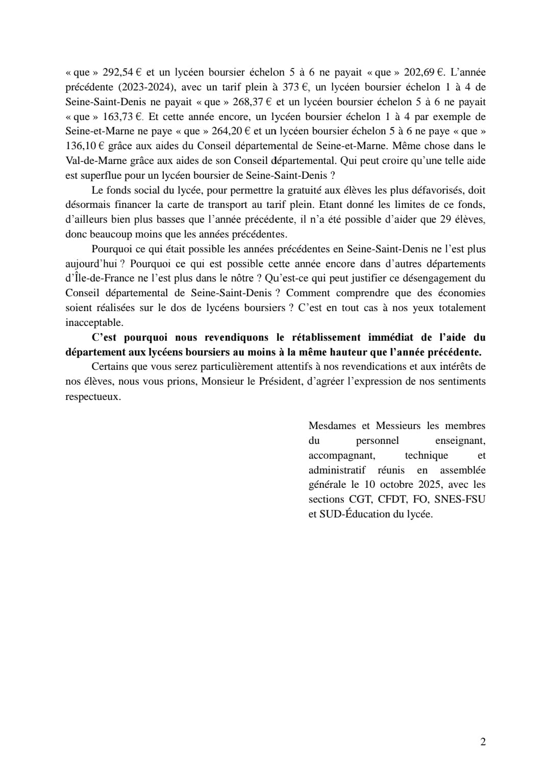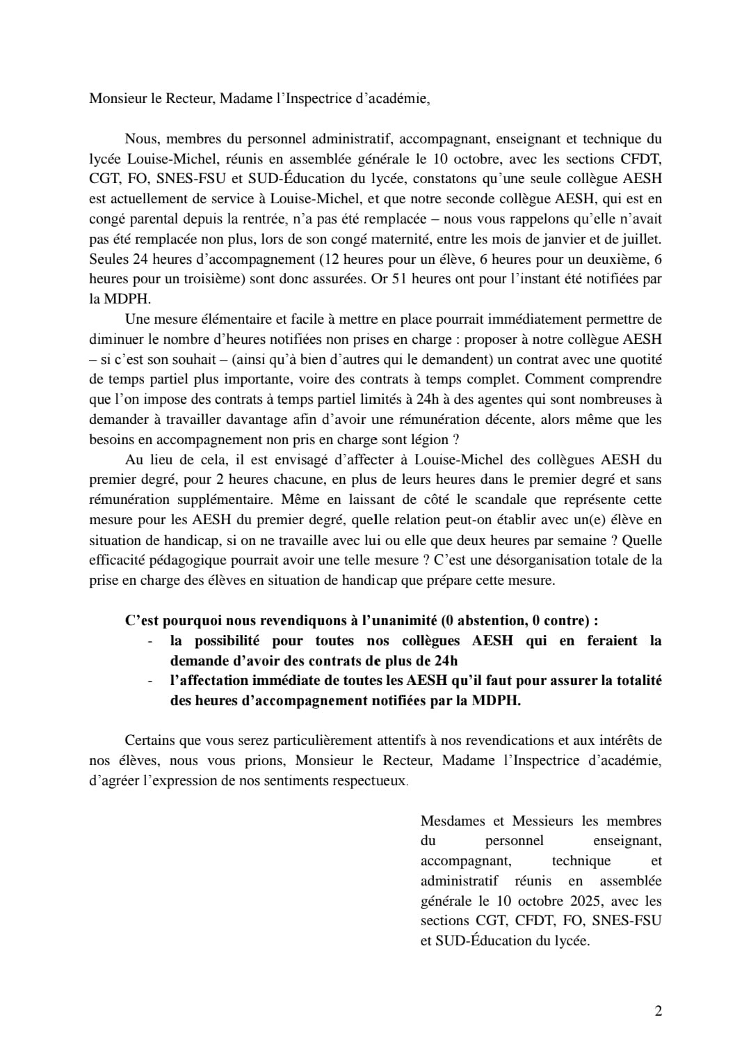 Vous êtes ici : Accueil actu des établissements Seine-Saint-Denis Le lycée Louise Michel (Bobigny) en lutte contre le démantèlement du service public 17 novembre 2025 actu des établissements Le lycée Louise Michel (Bobigny) en lutte contre le démantèlement du service public Courrier des personnels au recteur et à la DASEN 93.