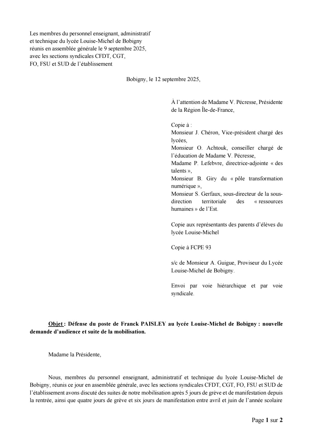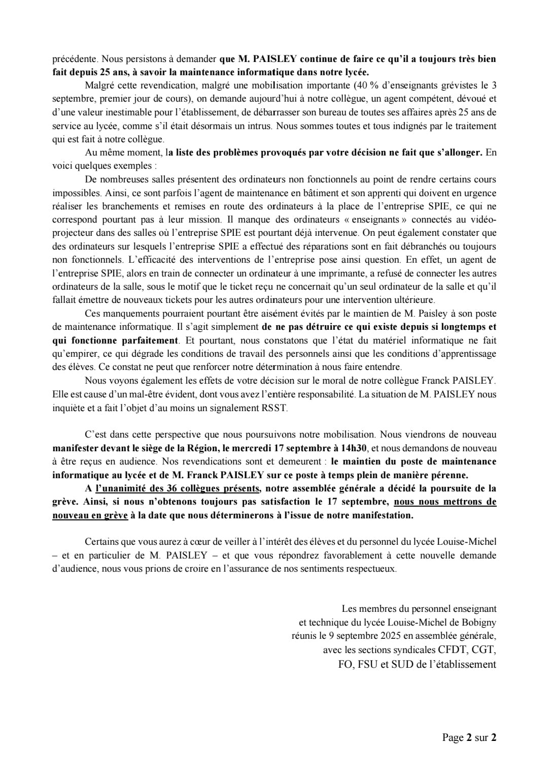 Vous êtes ici : Accueil actu des établissements Seine-Saint-Denis Le lycée Louise Michel (Bobigny) toujours mobilisé pour le maintien du personnel en charge de la maintenance informatique 17 septembre 2025 actu des établissements Le lycée Louise Michel (Bobigny) toujours mobilisé pour le maintien du personnel en charge de la maintenance informatique