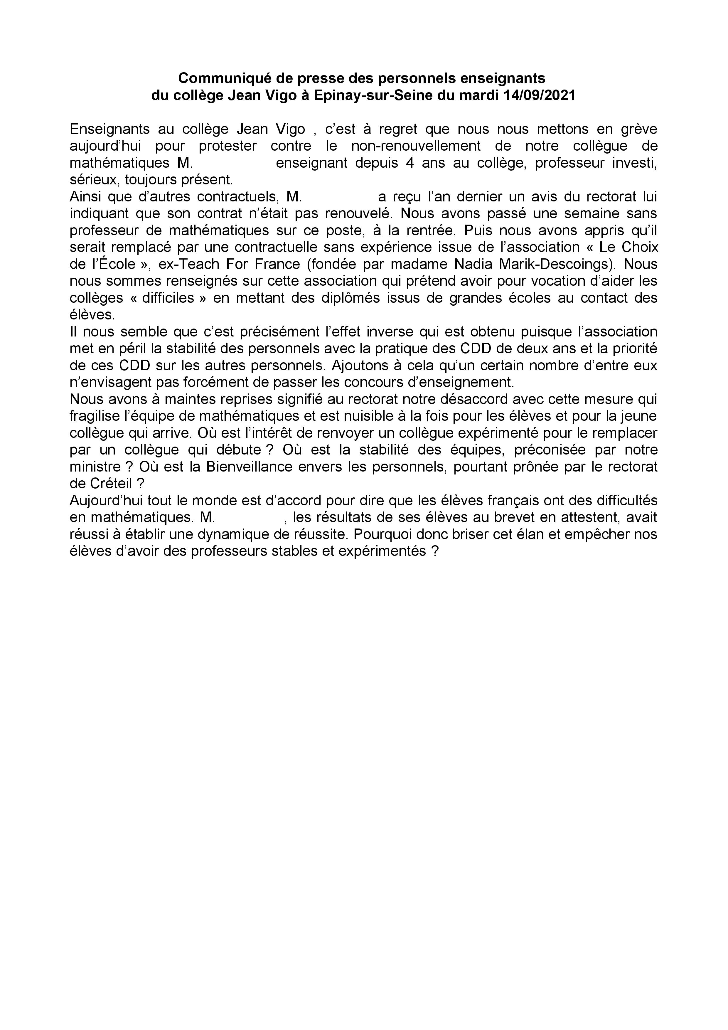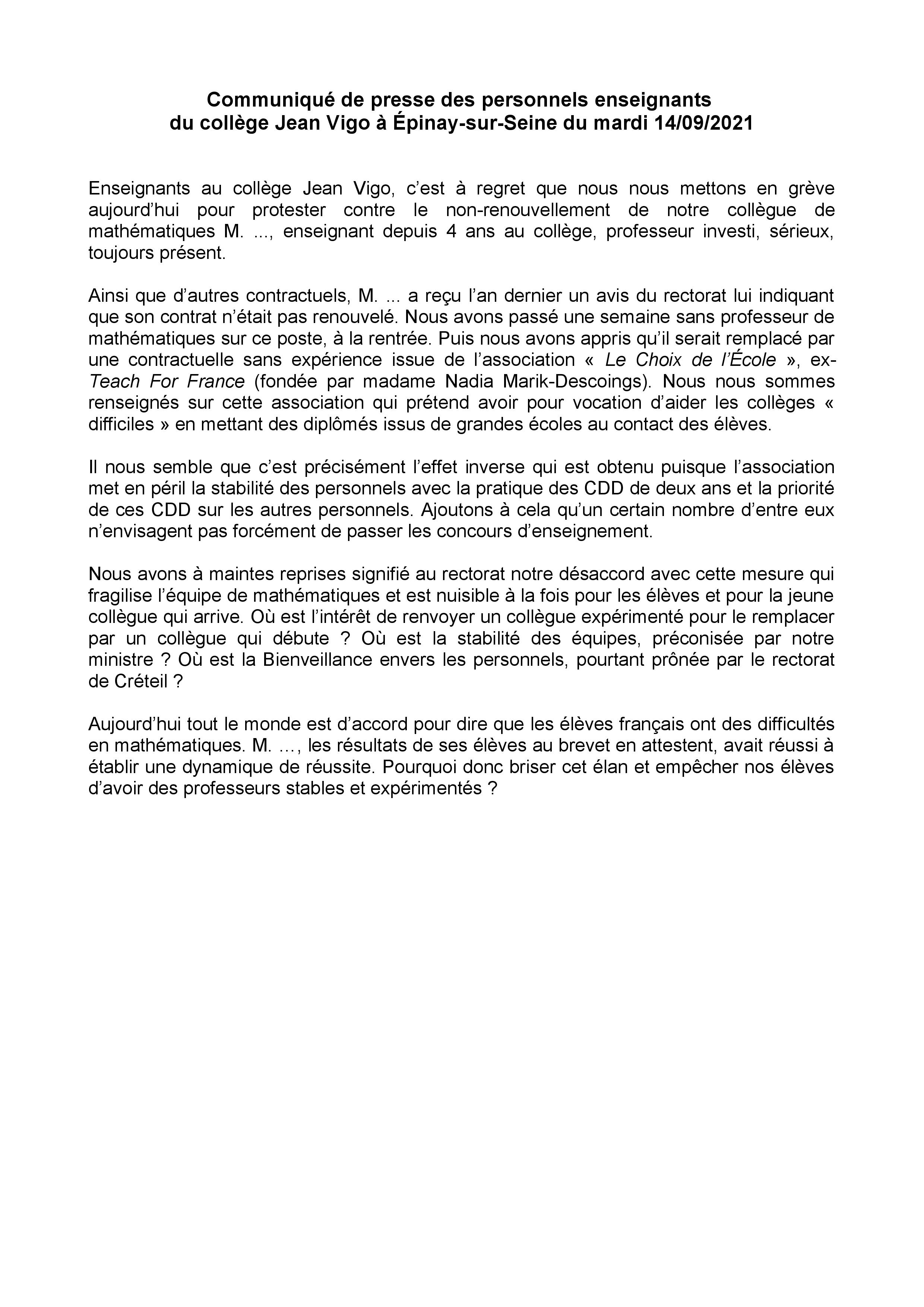 Vous êtes ici : Accueil actu des établissements Seine-Saint-Denis Les enseignant·e·s de Jean Vigo font grève contre le non-renouvellement d’un collègue au profit d’une enseignante issue du Choix de l’École ! 14 septembre 2021 actu des établissements Les enseignant·e·s de Jean Vigo font grève contre le non-renouvellement d’un collègue au profit d’une enseignante issue du Choix de l’École ! Communiqués de presse, 14 septembre 2021.