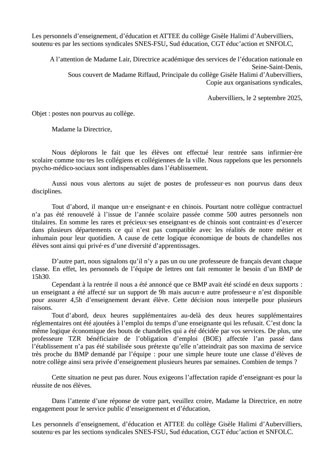 Vous êtes ici : Accueil actu des établissements Seine-Saint-Denis Les personnels du collège Gisèle Halimi(Aubervilliers) s’alarment des conditions de rentrée 5 septembre 2025 actu des établissements Les personnels du collège Gisèle Halimi(Aubervilliers) s’alarment des conditions de rentrée