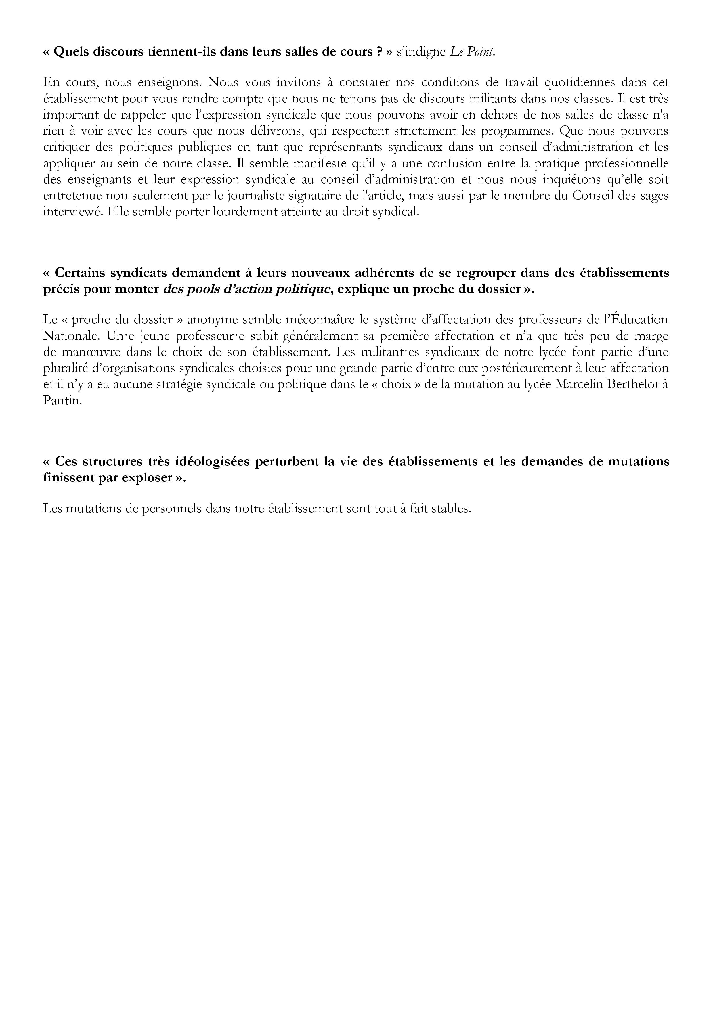 Les personnels du lycée Marcelin Berthelot (Pantin) répondent aux déclarations d’une IA-IPR dans Le Point et au communiqué du Conseil des Sages de la Laïcité !