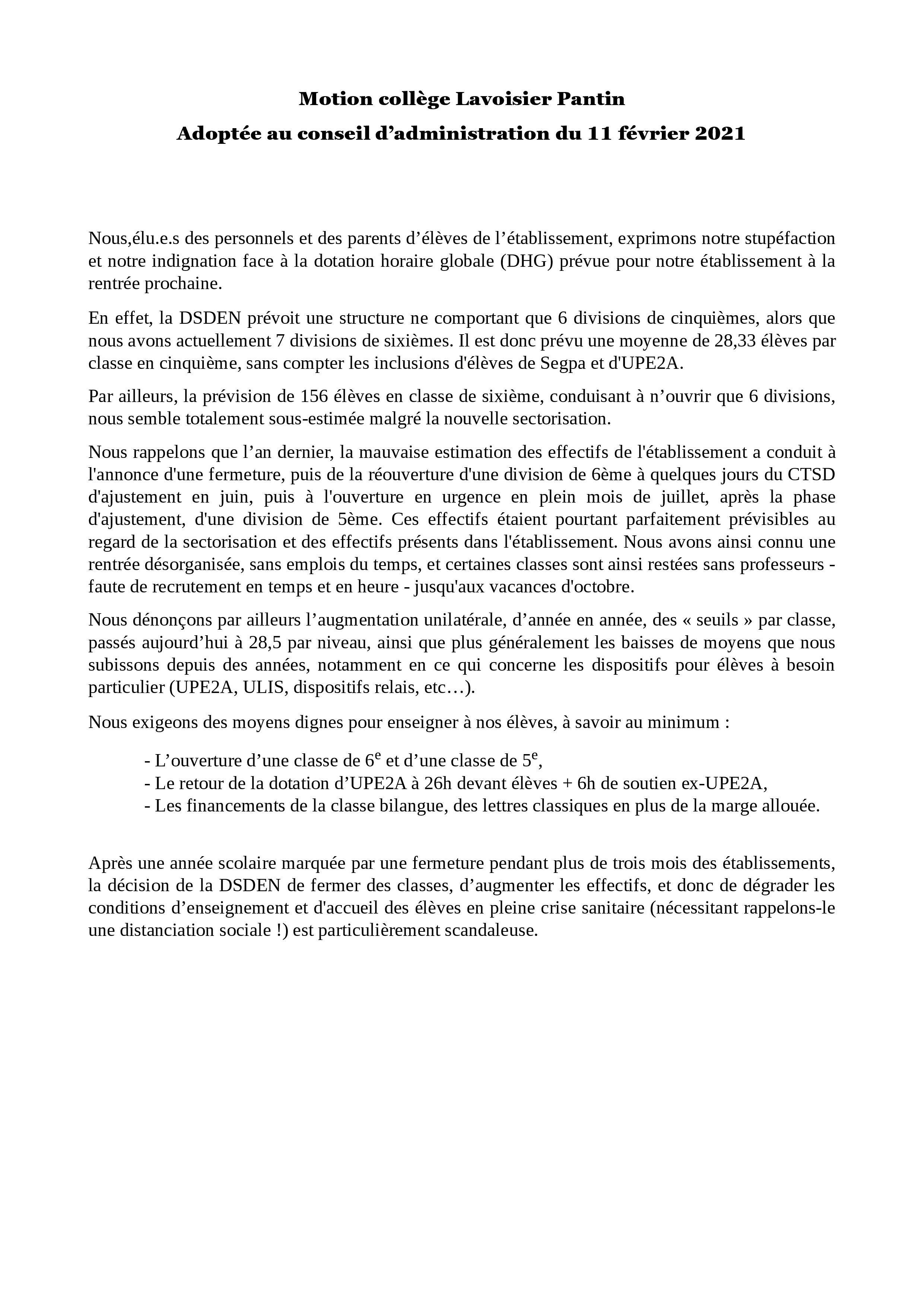 Vous êtes ici : Accueil actu des établissements Seine-Saint-Denis Motion DHG adoptée en CA - CLG Lavoisier (Pantin) - 11.02.2021 12 février 2021 actu des établissements Motion DHG adoptée en CA - CLG Lavoisier (Pantin) - 11.02.2021