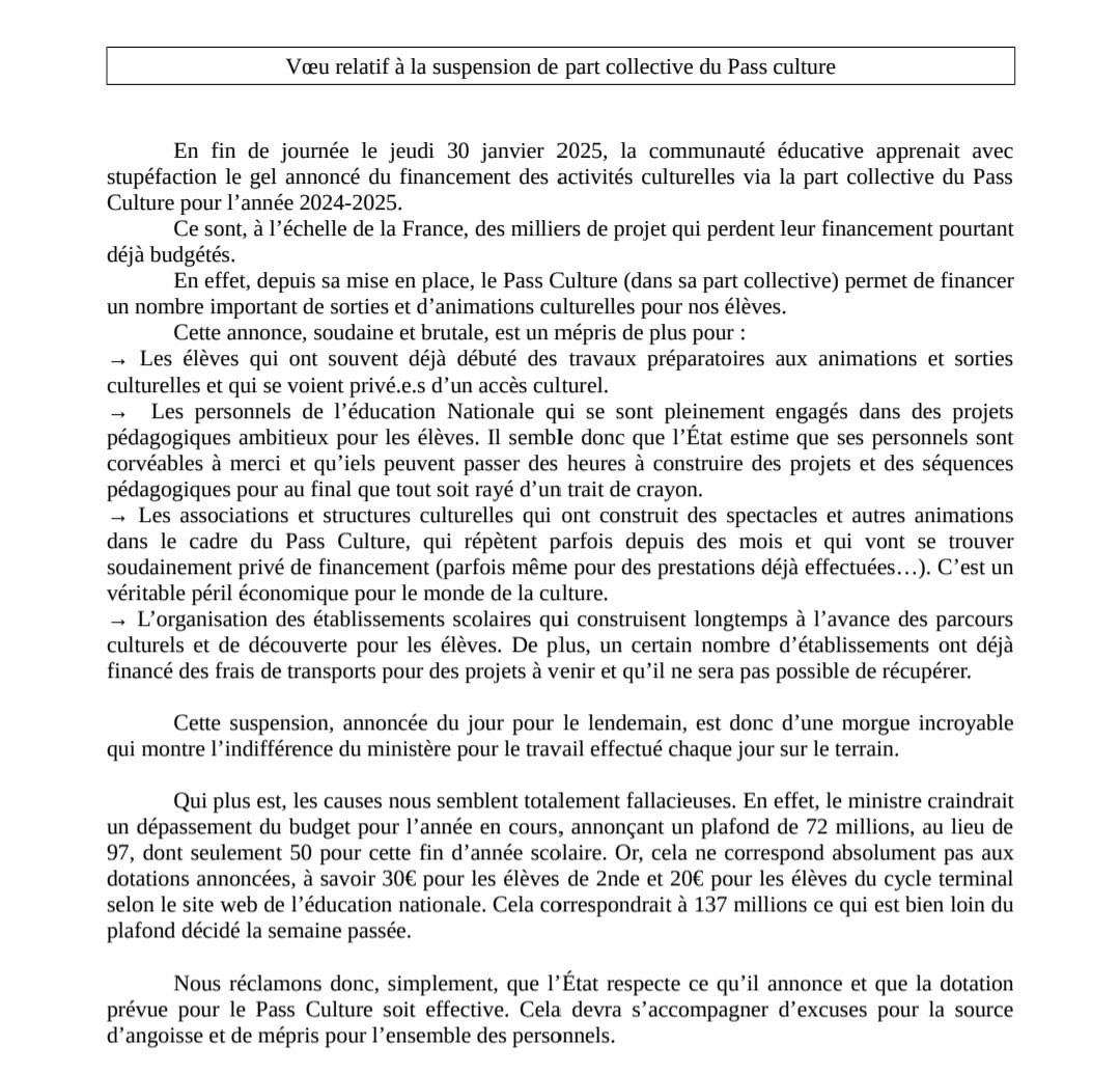 Vous êtes ici : Accueil actu des établissements Seine-Saint-Denis Motion contre le gel du Pass culture 9 février 2025 actu des établissements Motion contre le gel du Pass culture Faites voter cette motion dans tous les CA d’établissement du 93 !