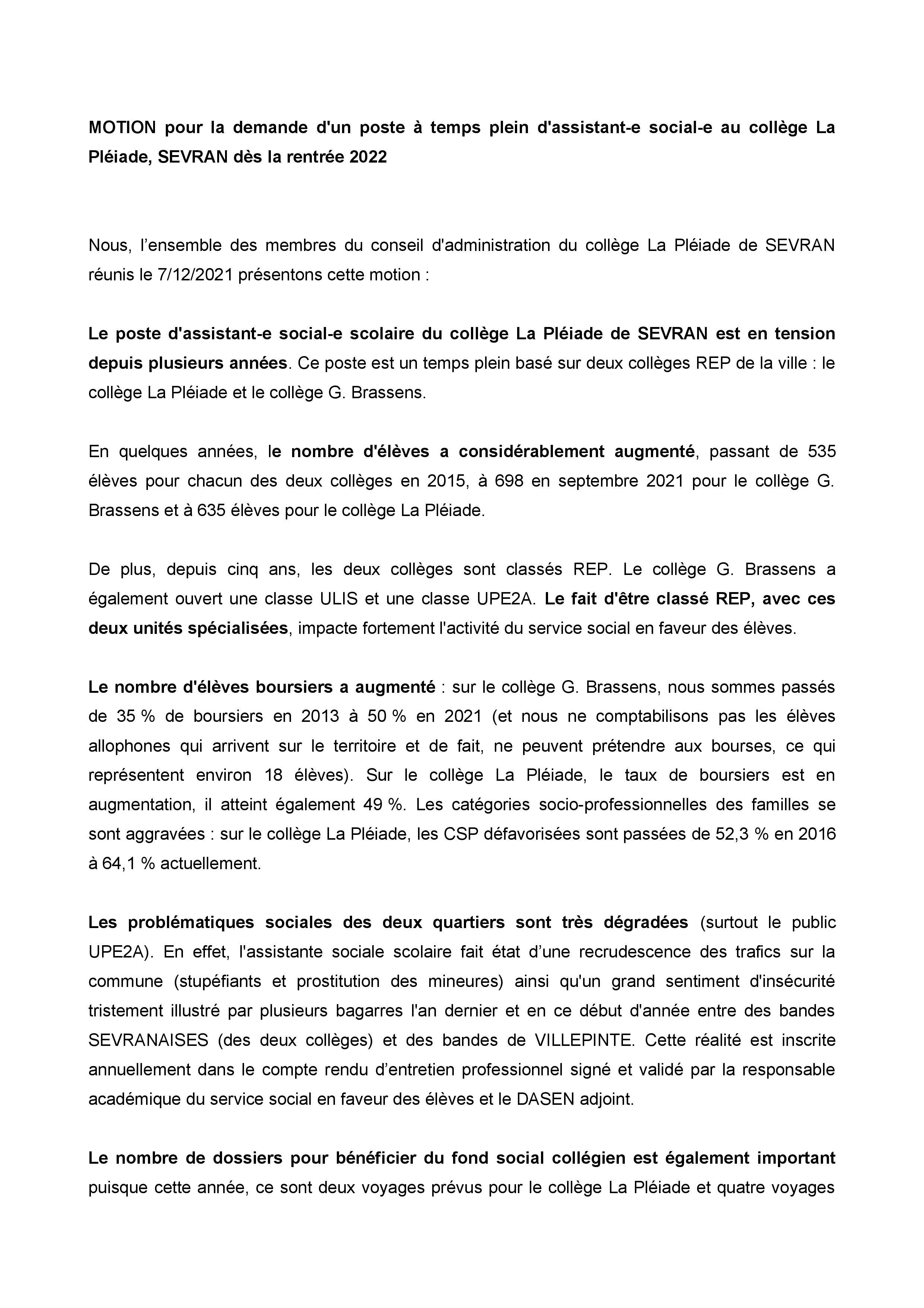 Vous êtes ici : Accueil actu des établissements Seine-Saint-Denis Motion en faveur d’un poste à temps plein d’assistant·e social·e au collège La Pléiade et au collège Georges Brassens (Sevran) à la rentrée 2022 11 janvier 2022 actu des établissements Motion en faveur d’un poste à temps plein d’assistant·e social·e au collège La Pléiade et au collège Georges Brassens (Sevran) à la rentrée 2022