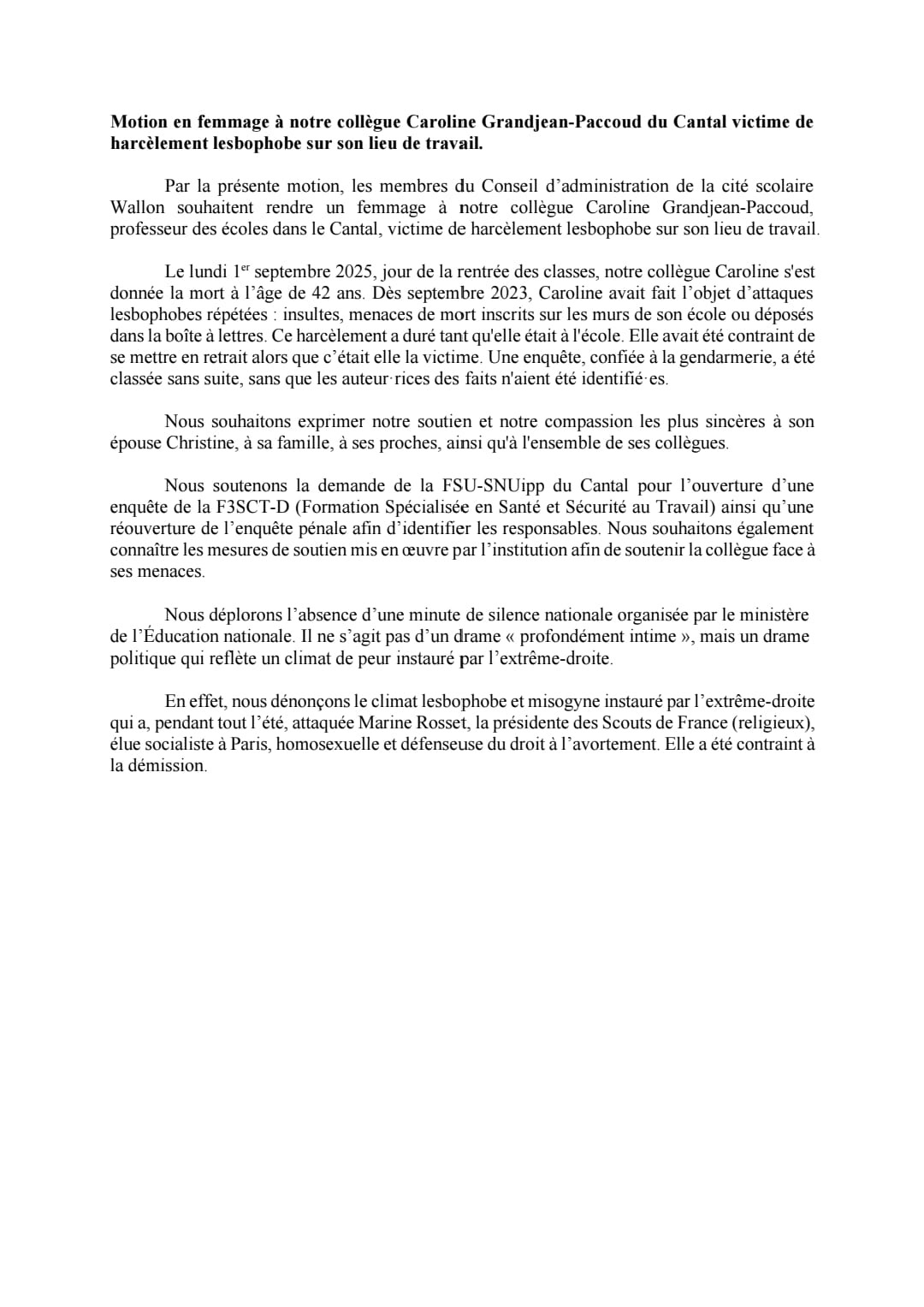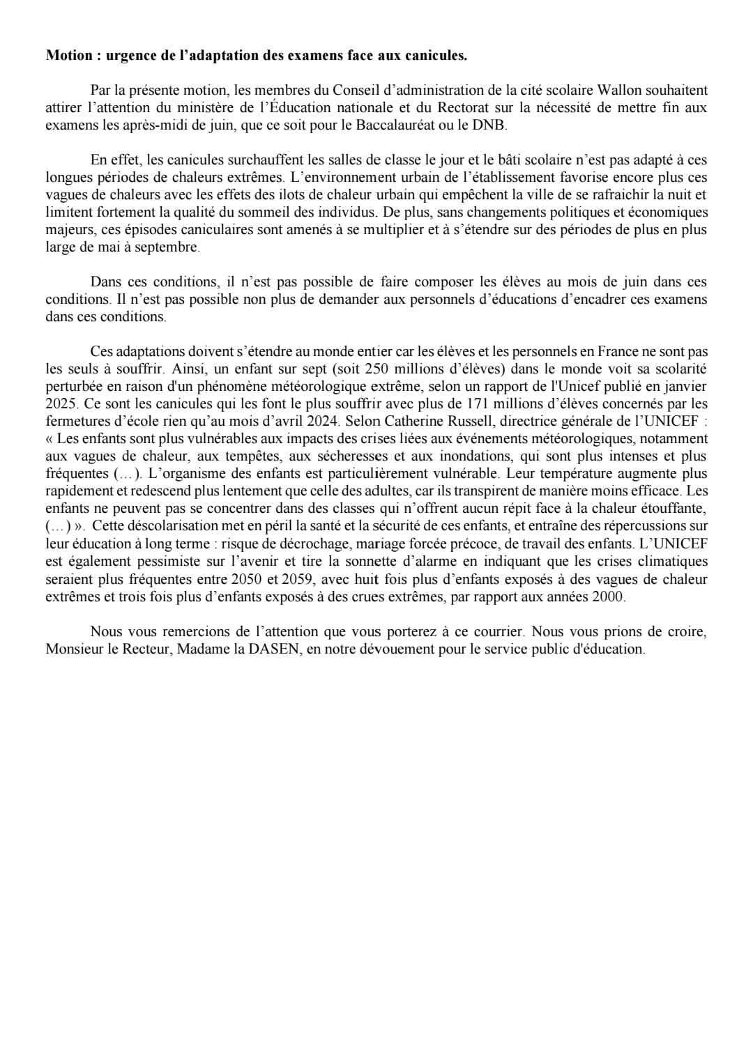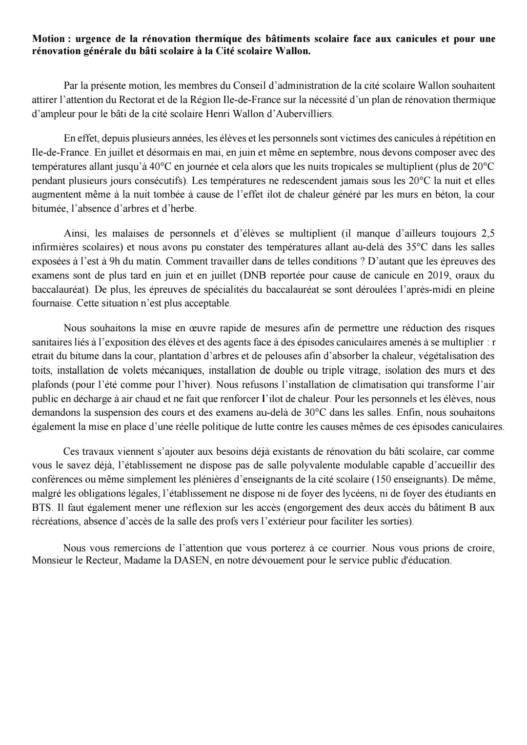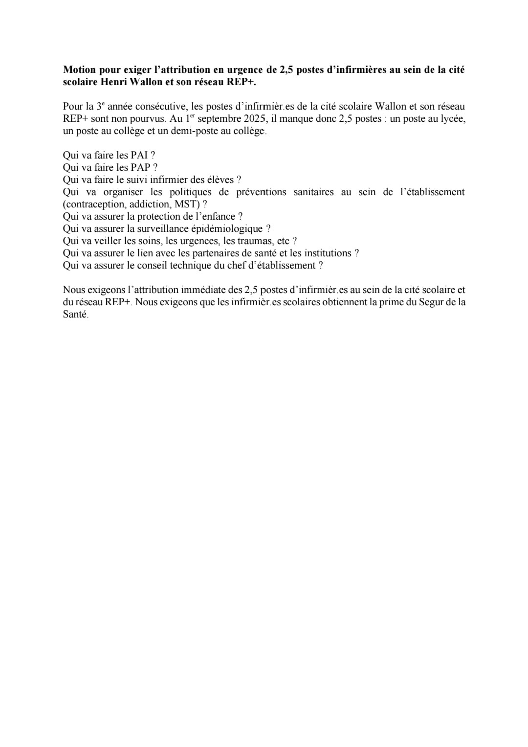 Vous êtes ici : Accueil actu des établissements Seine-Saint-Denis Motions des personnels de la cité scolaire Henri Wallon (Aubervilliers) au CA 11 septembre 2025 actu des établissements Motions des personnels de la cité scolaire Henri Wallon (Aubervilliers) au CA