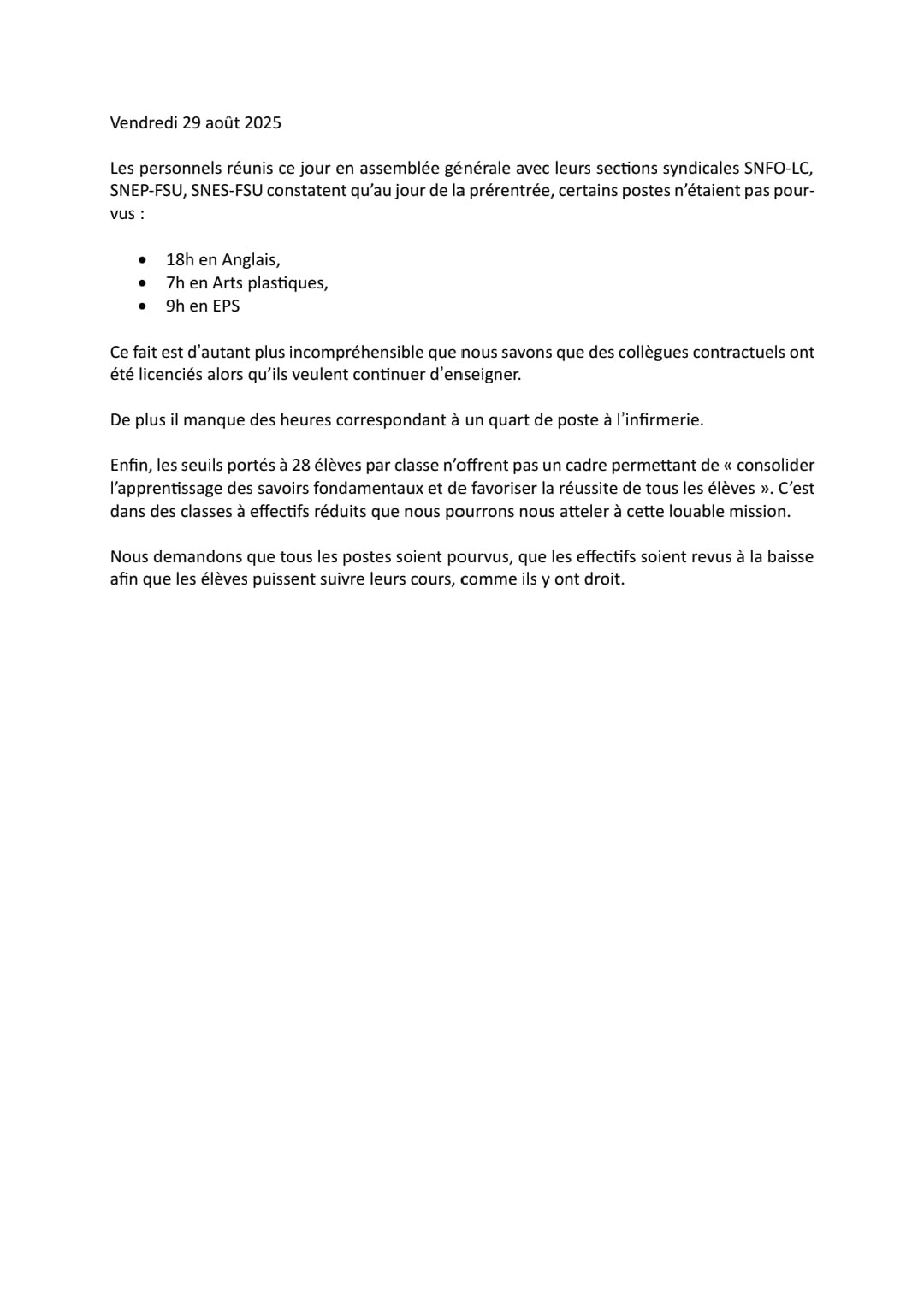 Vous êtes ici : Accueil actu des établissements Seine-Saint-Denis Motions des personnels du collège Marie Curie(Les Lilas) sur les conditions de rentrée 5 septembre 2025 actu des établissements Motions des personnels du collège Marie Curie(Les Lilas) sur les conditions de rentrée