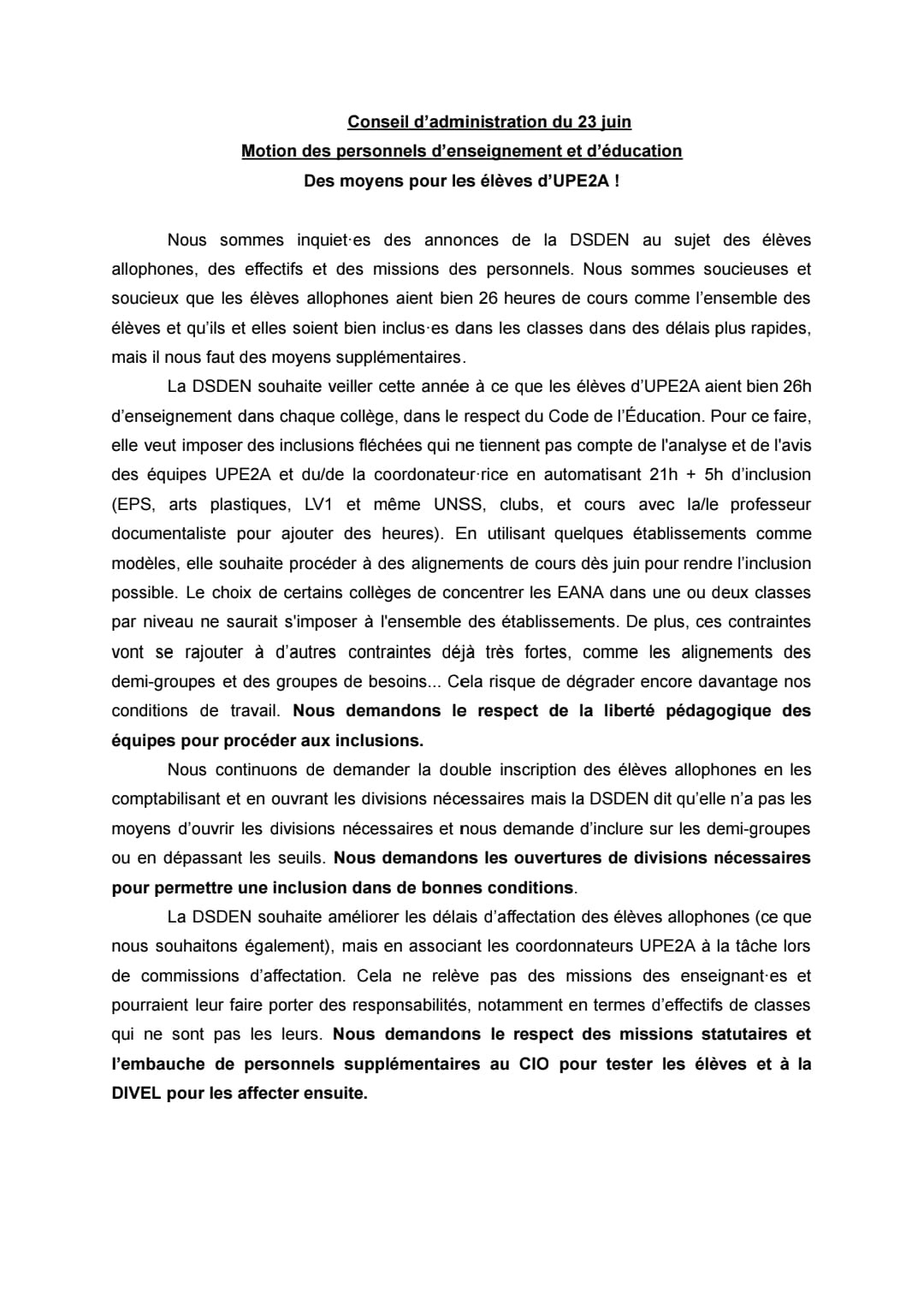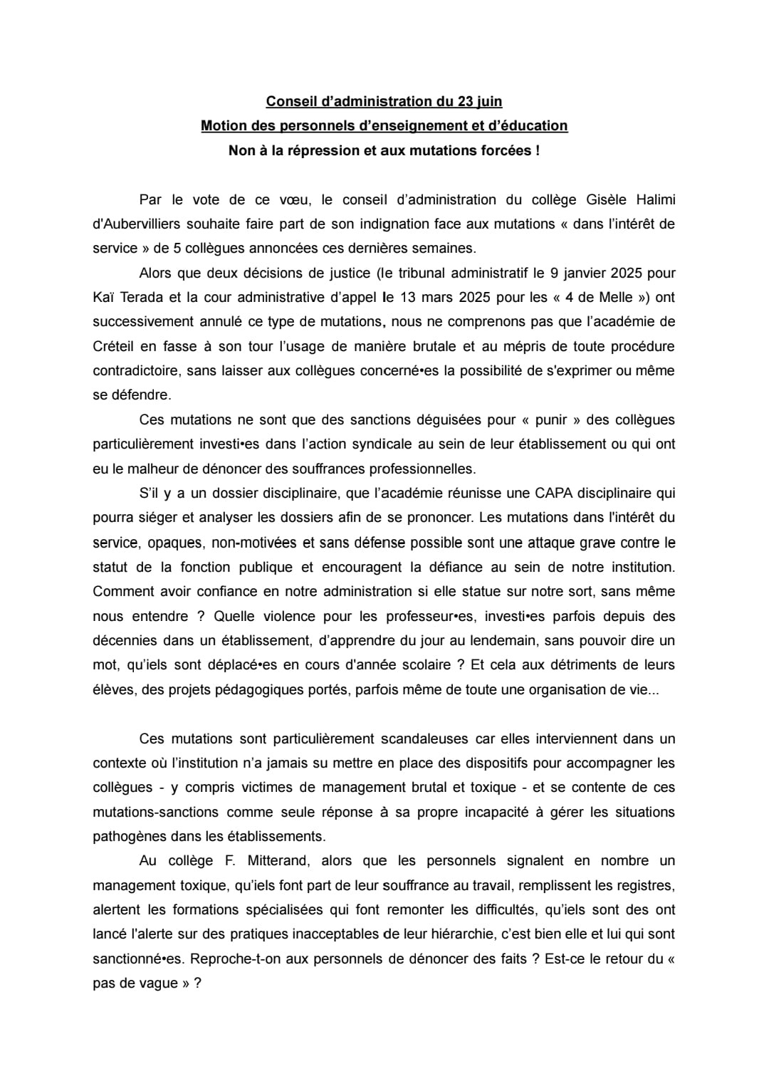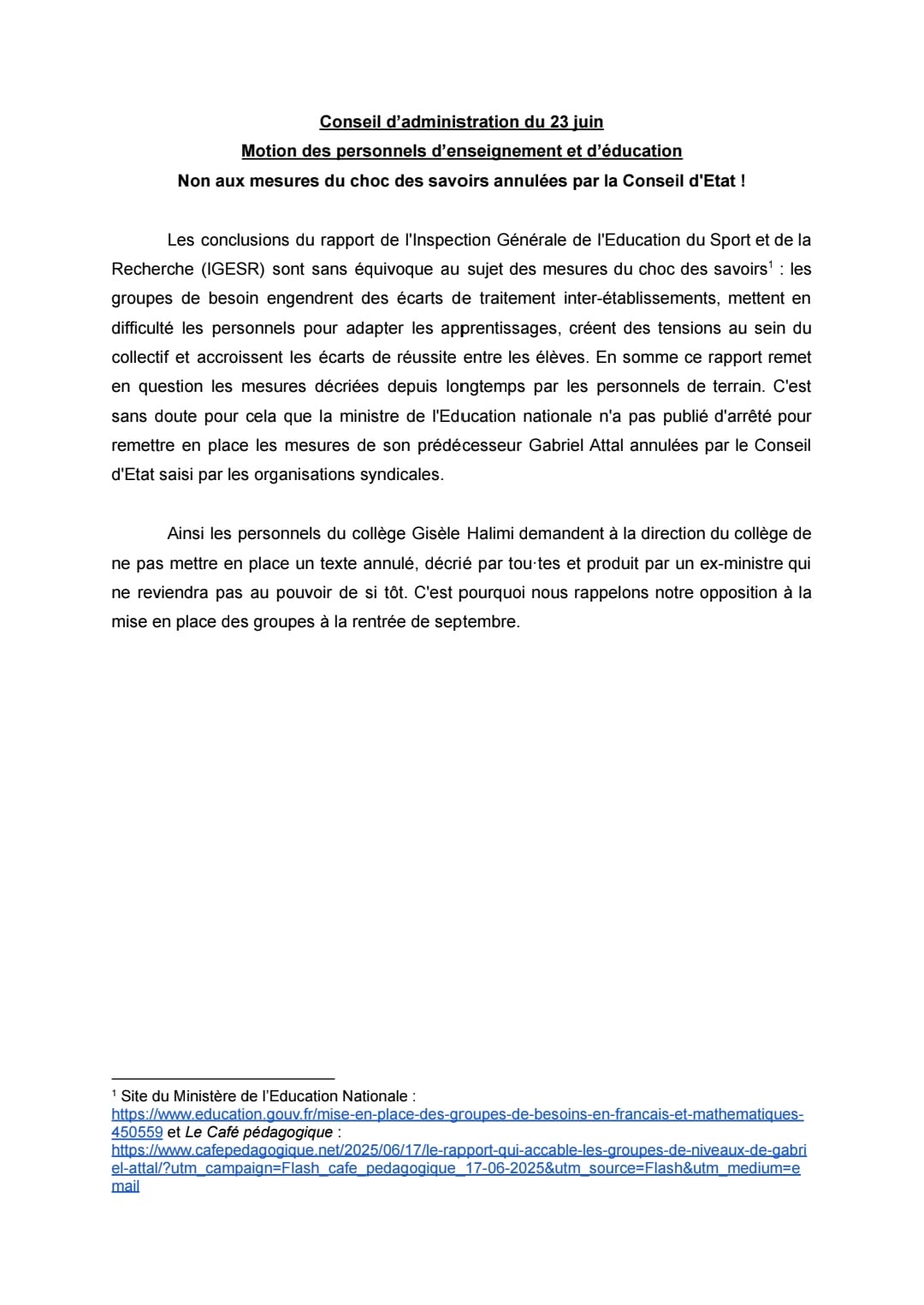 Vous êtes ici : Accueil actu des établissements Seine-Saint-Denis Motions votées au collège Gisèle Halimi (Aubervilliers) 27 juin 2025 actu des établissements Motions votées au collège Gisèle Halimi (Aubervilliers)