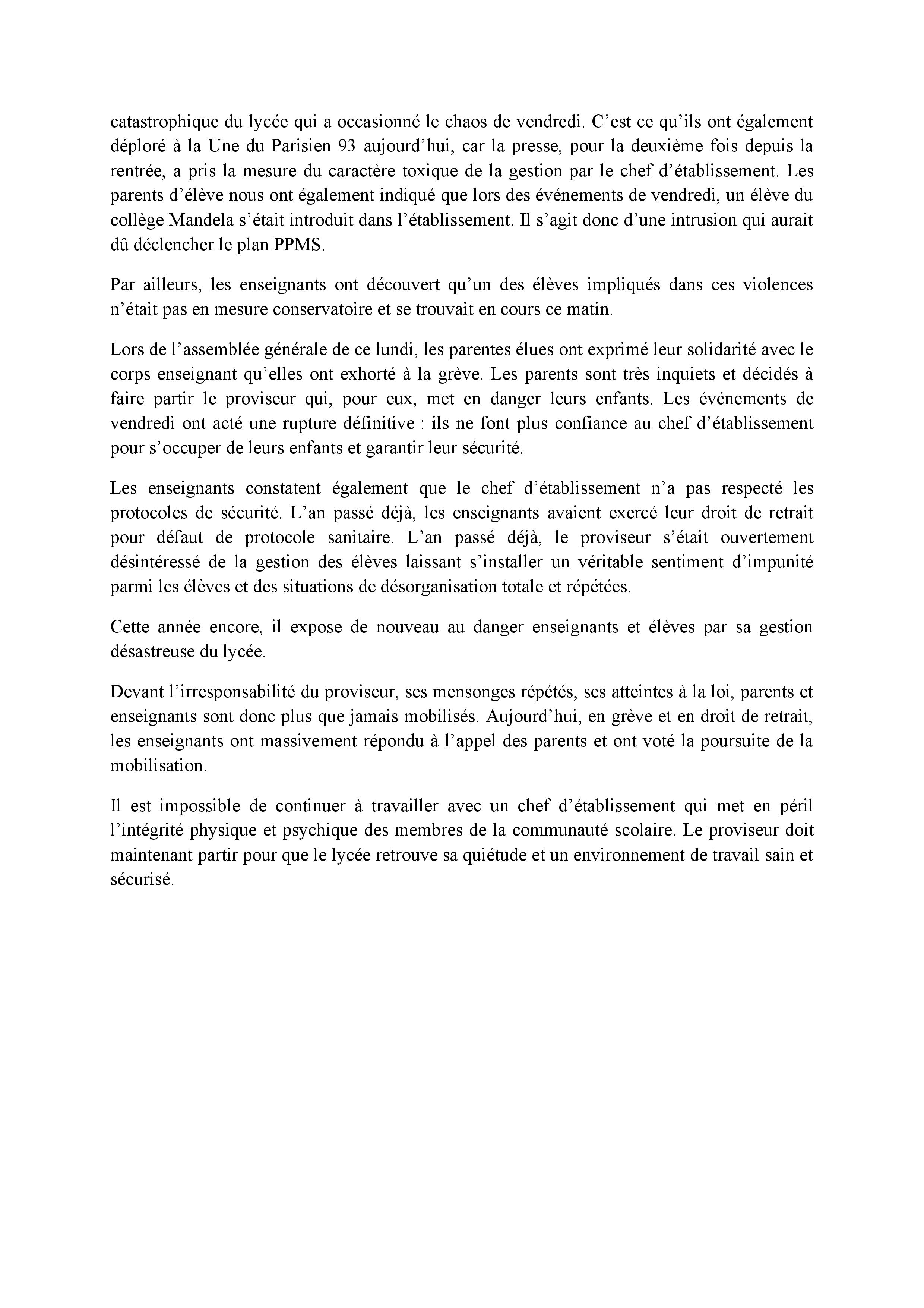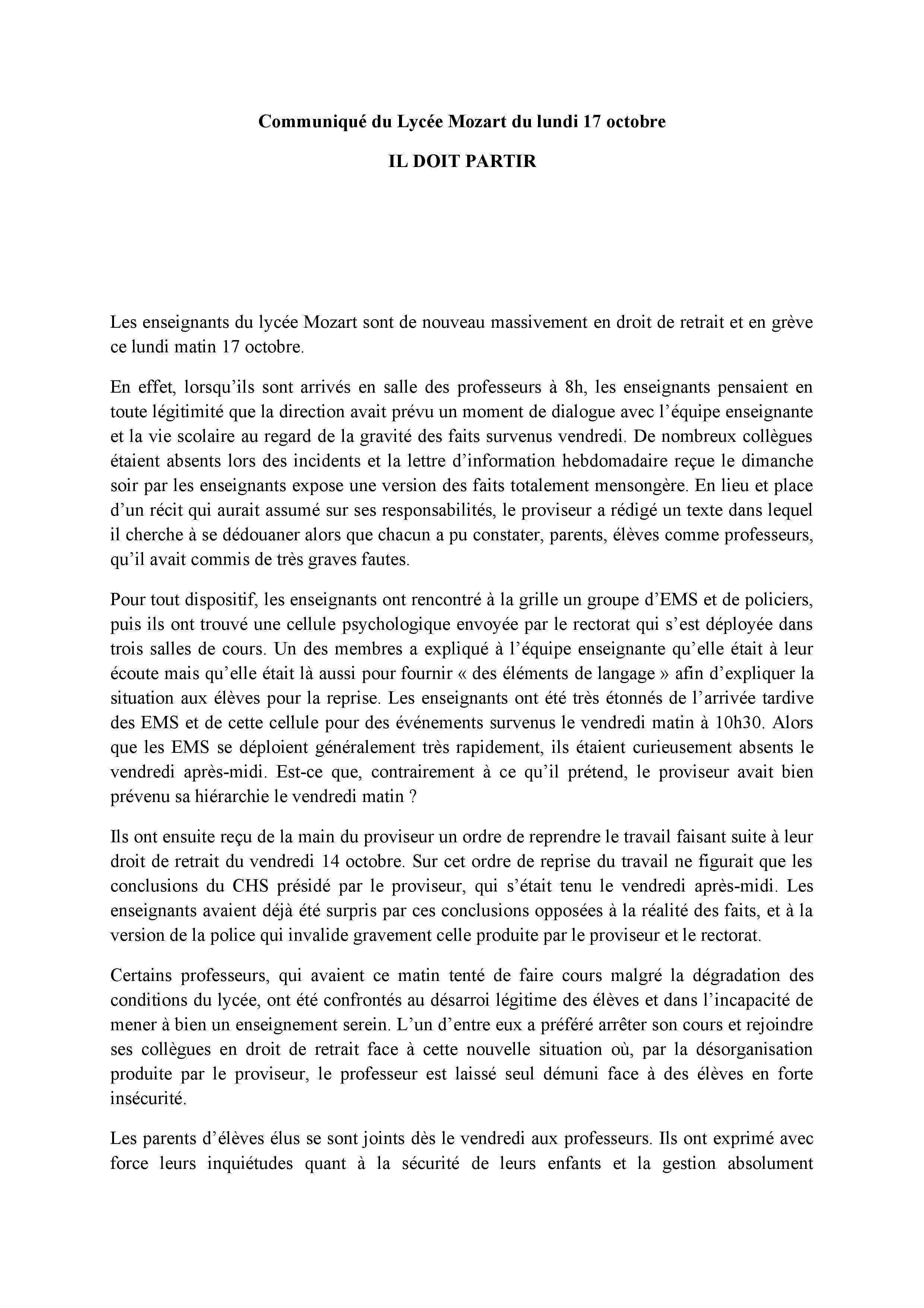 Vous êtes ici : Accueil actu des établissements Seine-Saint-Denis Nouveau droit de retrait massif des personnels du lycée Mozart (Le Blanc-Mesnil) : le chef d’établissement doit partir ! 17 octobre 2022 actu des établissements Nouveau droit de retrait massif des personnels du lycée Mozart (Le Blanc-Mesnil) : le chef d’établissement doit partir ! Communiqué du 17 octobre 2022, avec le soutien des parents d’élèves.