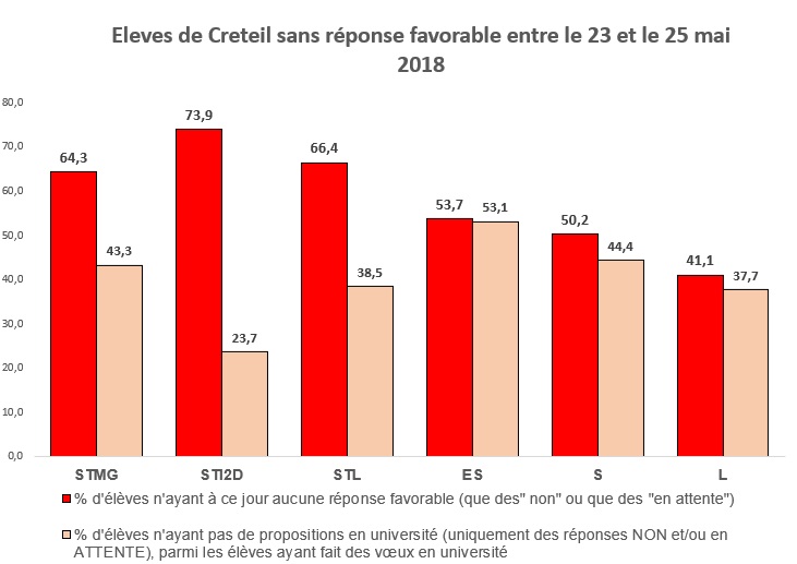 Alors que le Ministère de l’Éducation Nationale annonçait, à la publication des premiers résultats de Parcoursup, que 50% des élèves y avaient reçu au moins une réponse positive, ce pourcentage est plus faible dans l’académie de Créteil (42,4% en Seine-et-Marne, 45,3% en Seine-Saint-Denis, 54,8% dans le Val-de-Marne). C’est ce que montre le sondage réalisé par le SNES-FSU Créteil auprès de ses sections d’établissement. 45% des élèves qui avaient formulé un vœu en université dans une filière dite « non sélective » étaient même sur liste d’attente.