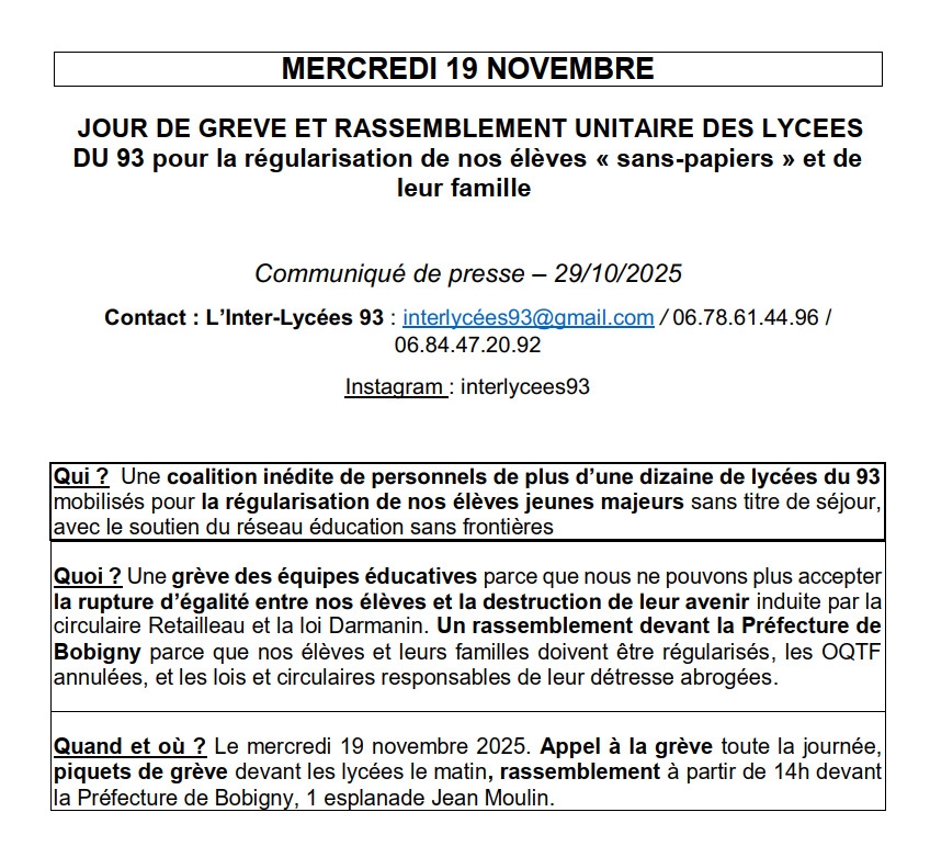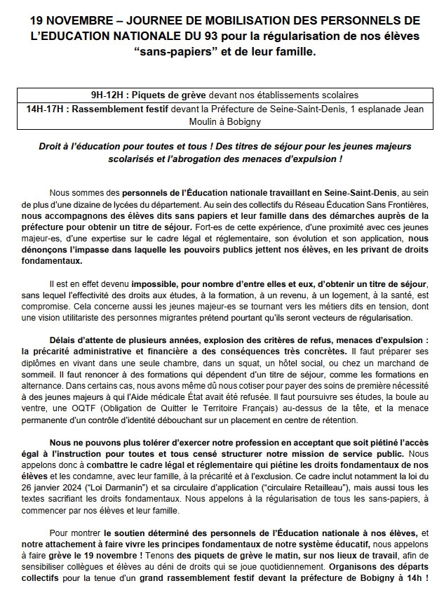 Les personnels mobilisé.es de Seine-Saint-Denis appellent à la grève le mercredi 19 novembre pour soutenir les élèves « sans papiers » et leurs familles. Un rassemblement est appelé devant la préfecture de Seine-Saint-Denis.