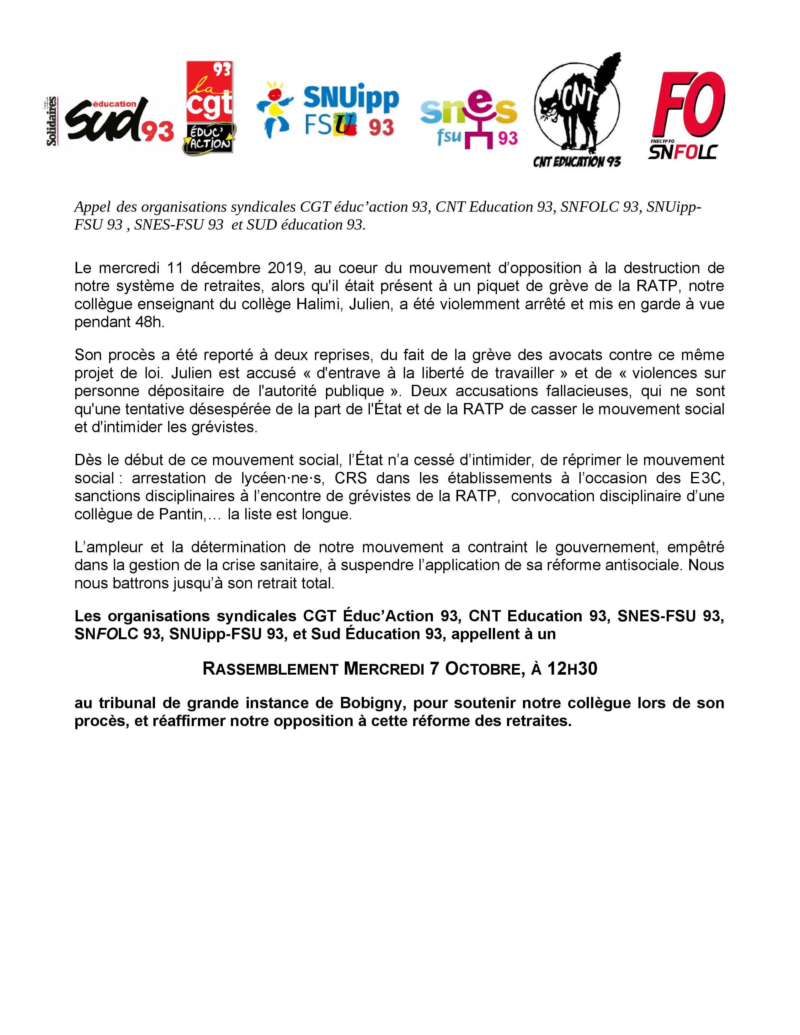 Vous êtes ici : Accueil actu des établissements Seine-Saint-Denis Rassemblement de soutien à Julien, contre la repression du mouvement social - Appel intersyndical 2 octobre 2020 actu des établissements Rassemblement de soutien à Julien, contre la repression du mouvement social - Appel intersyndical